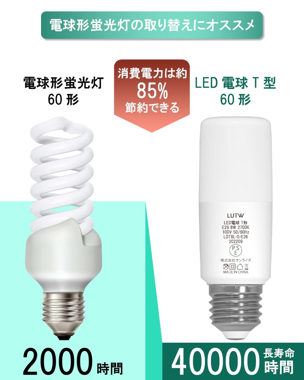 【特価商品】LUTW LED電球 T形タイプ E26口金 60W形相当 電球色 2700K 8W 810LM 260°配光角 調光不可 断熱材施工器具対応 EFD15 EFD25代替推奨 6個入 LDT8L-G-E26/S | Premium Stage