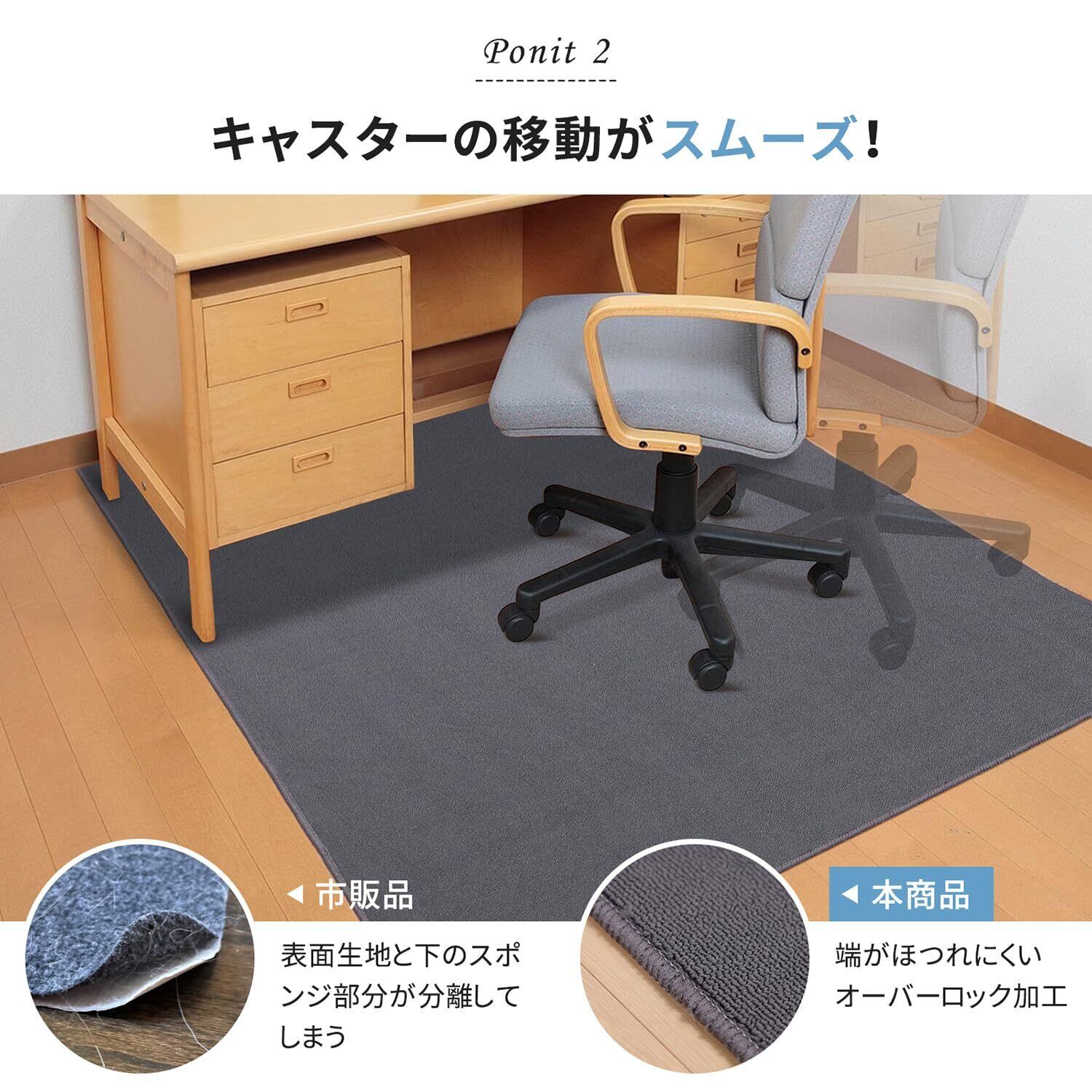 「騒音・ほつれ対策」●改良を重ねた5㎜の厚さでキャスターの移動がスムーズ! 小さな生活音も吸音し、和らげることができて、特にキャスター付きの椅子の場合、意外に大きなキャスターの回転音を軽減することもできるので、集合住宅ではマストアイテムと言えます。●端のほつれ対策としてオーバーロック加工、縁がしっかりと縫い上げられ、ほつれや破れが起きにくい 。