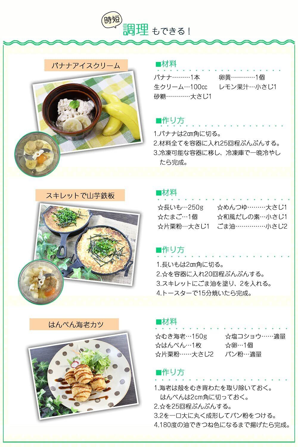 材質:本体/PS樹脂、ゴム足/TPR樹脂、フタ/ポリプロピレン・POM、ハンドル/ABS樹脂、シャフト/ポリエチレン、刃/ステンレス刃物鋼、保存用蓋/ポリプロピレン、混ぜ器/ポリプロピレン