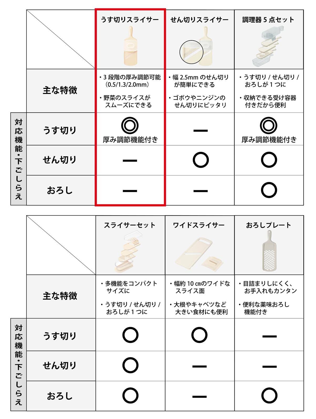 【厚み調節可能】セラミック刃だから「軽く、素早く、キレイに切れる」スライサー。3段階(0.5mm・1.3mm・2.0mm)の厚みに調節が可能。玉ねぎやきゅうり、パプリカ、キャベツなど食材によって使い分けられる。キャベツのせん切りも簡単
