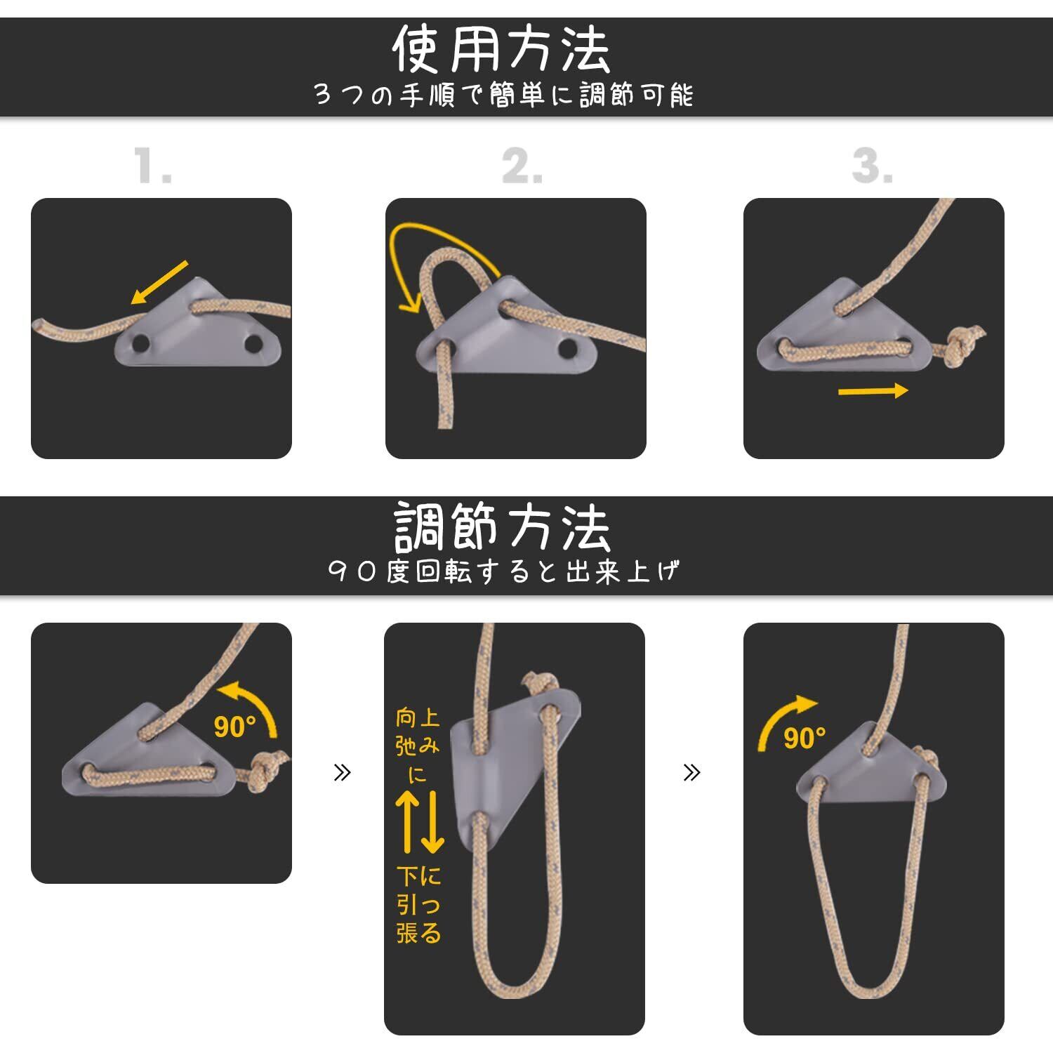三角形の自在金具:普通のU形2穴自在金具ではなく、三角形自在はガイロープ通す穴が斜めになっている仕組みでしっかりしています。 テントやタープを組み立てるときに巻き取りロープの長さを調整する多目的自在金具です! 従来型の形より固定力も更にアップし、風が強い時にも頑丈で切れなくて風防止や滑り止めによく役立ちます。