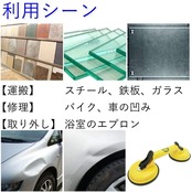 スチール、鉄板、ガラス等の運搬、バイクのタンク、車体の凹み修理、浴室のエプロンをはずす時などに活躍するリフターです。