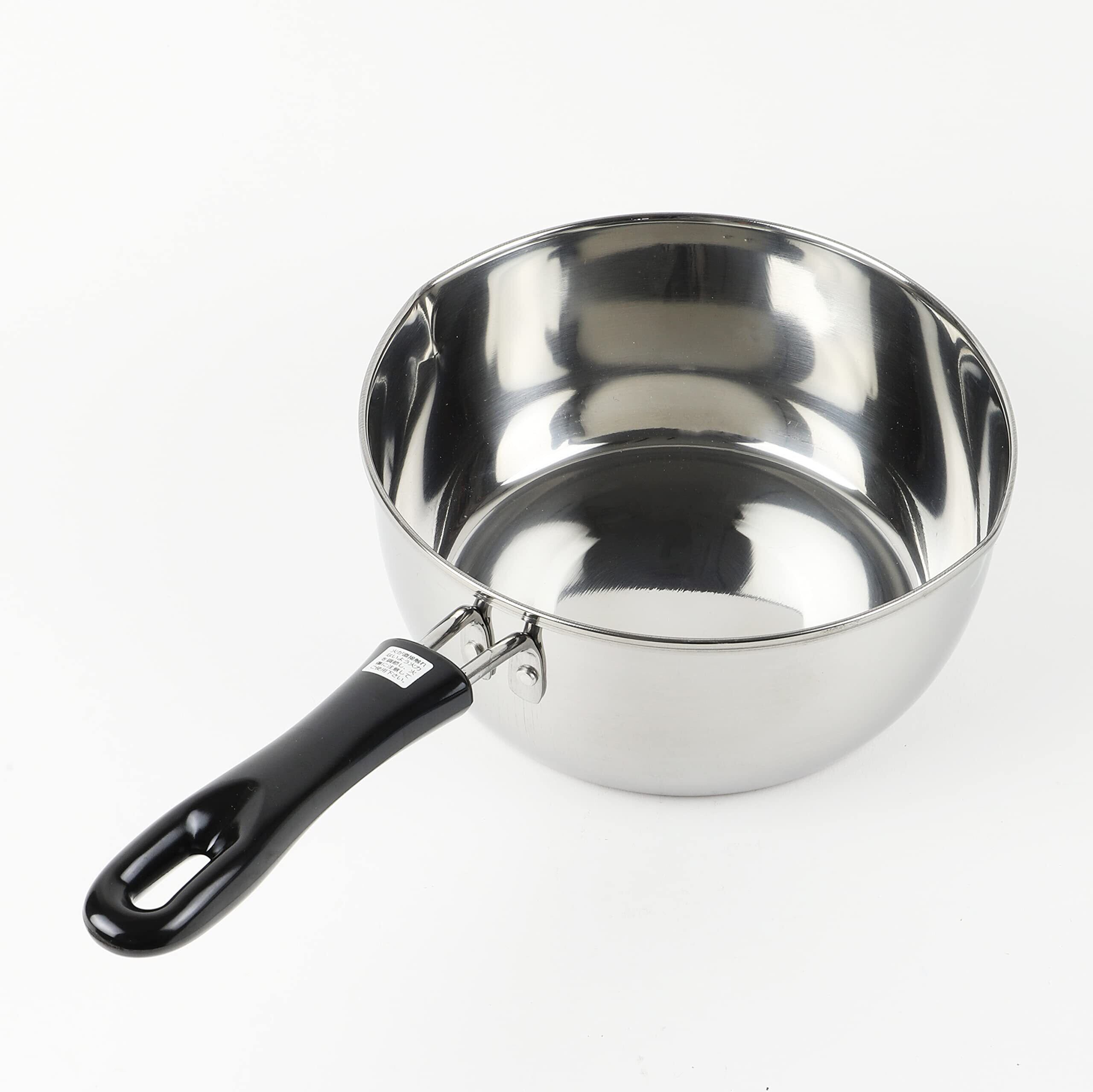 素材・材質:本体/ステンレス鋼(クロム16%)(底の厚さ0.5mm)、取っ手/フェノール樹脂(耐熱温度150度)、寸法:18cm、満水容量:2.0L