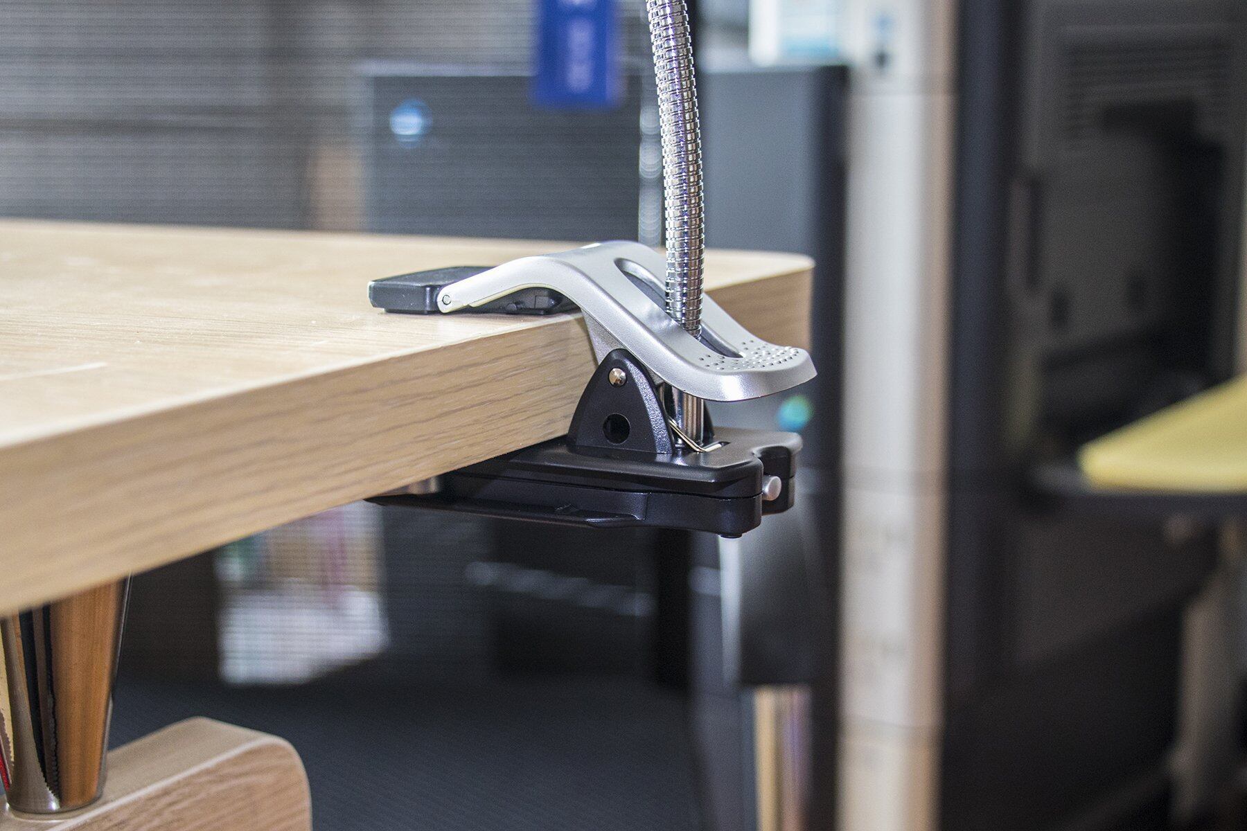 「クリップ付き」:特別仕様のクリップでデスクなどに安定性高い固定可能の為、使いやすいです。