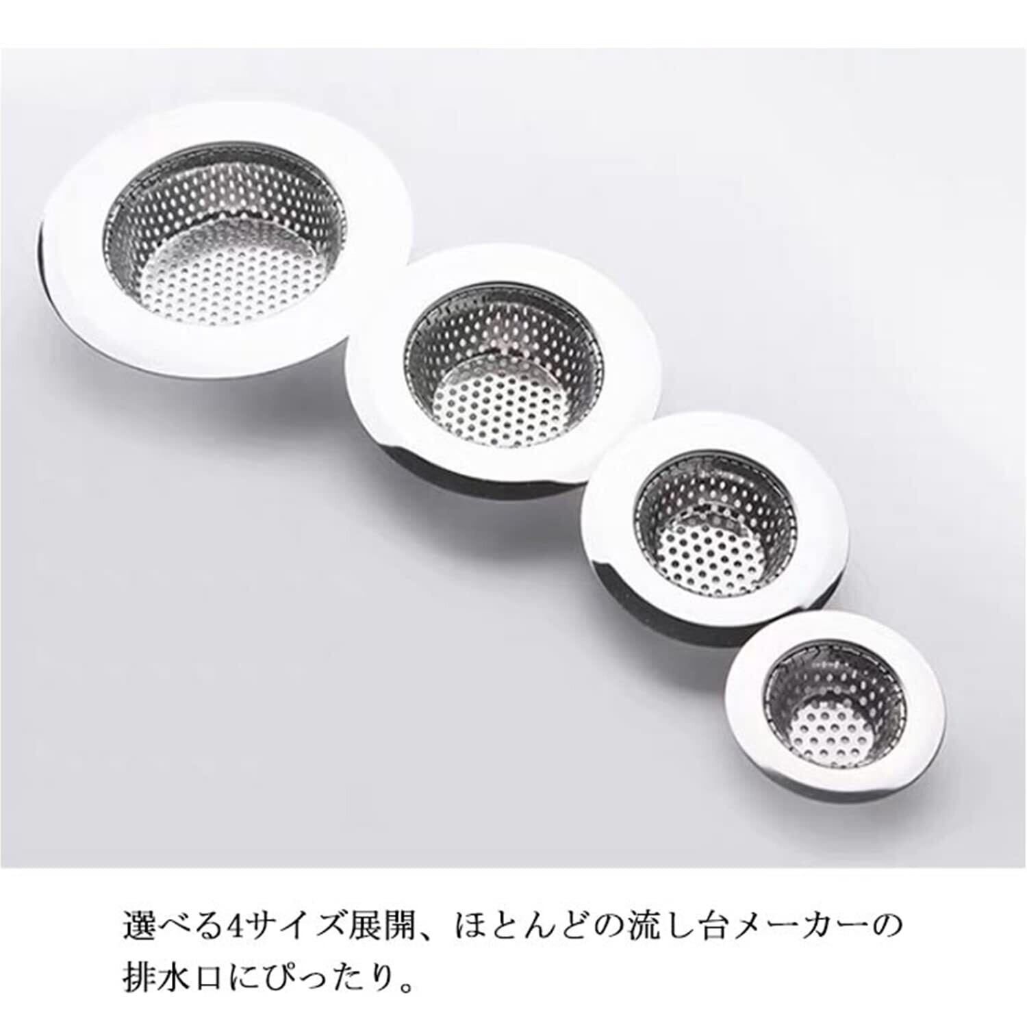 排水口にモノを落とすのを防ぎつつ、簡単に掃除できることができます。 ステンレス鋼を使用しているので、衛生的で錆びにくく丈夫。 底の丸い形状とパンチングメタルでゴミが集まる! 髪の毛やゴミが絡まず、するっと取れるのでとっても便利です。 選べる4サイズ展開、ほとんどの流し台メーカーの排水口にぴったり。 台所のシンクだけでなくユニットバスにも使えます。