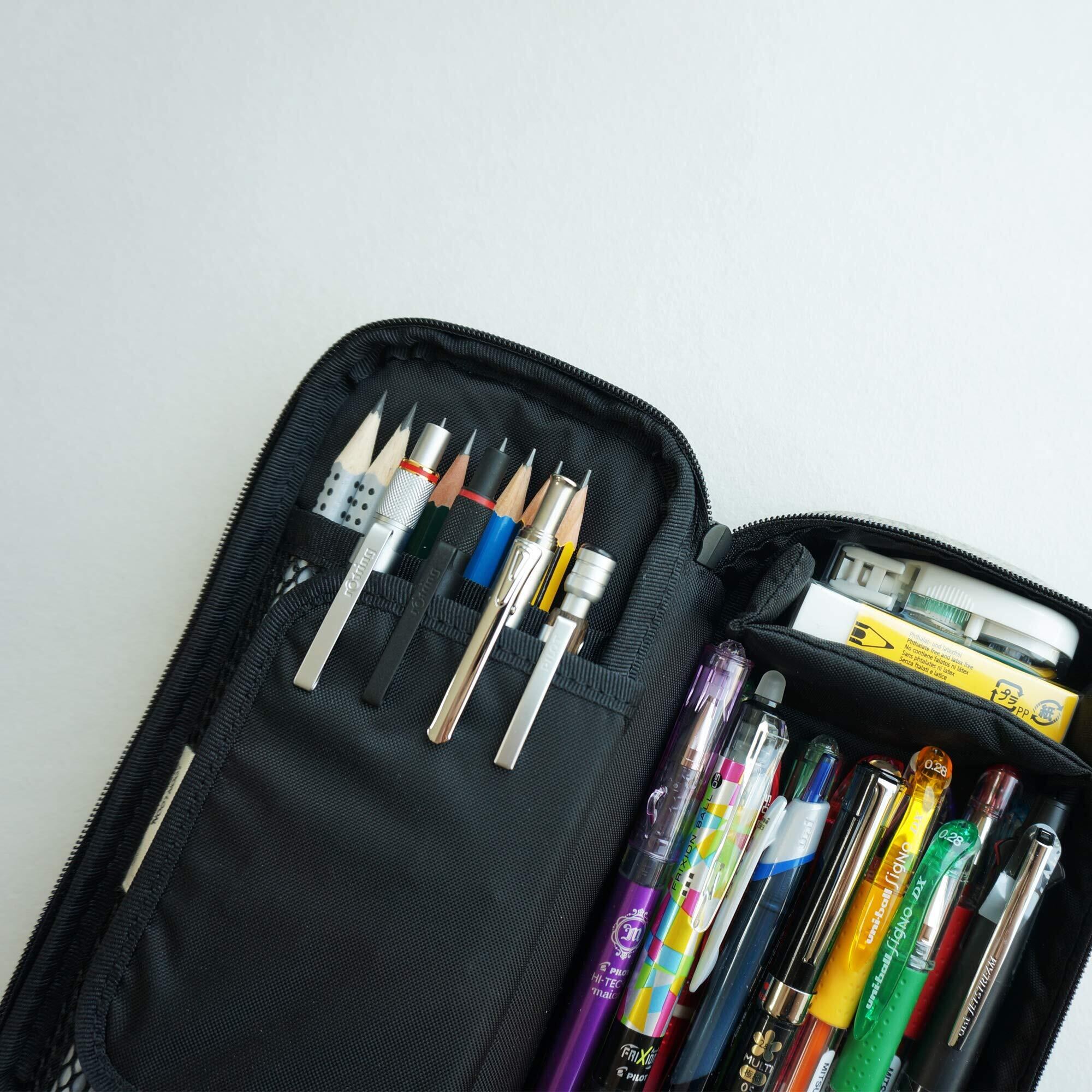 メッシュポケット1、消しゴム収納、ペンホルダー5個、大容量収納部
