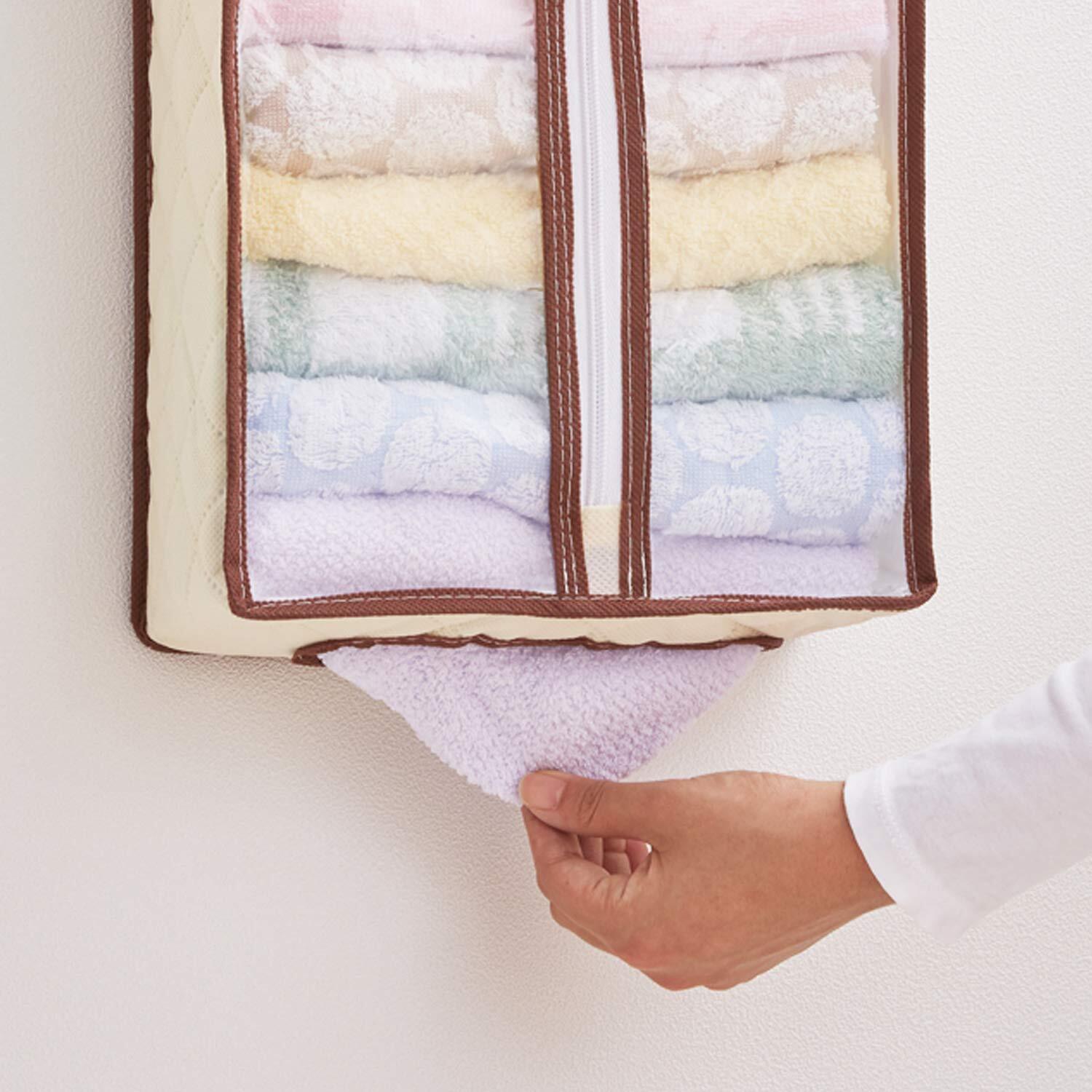 ●通気性のよい不織布で、ホコリや汚れからタオルをしっかりガード。壁掛け式のタオル収納。