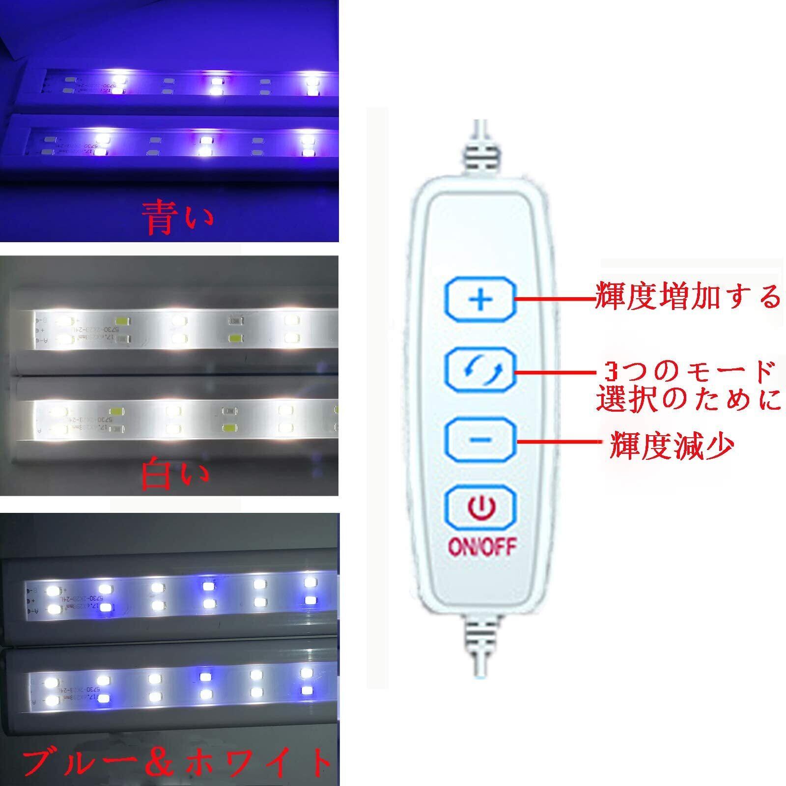 【植物成長のためのプロの3つの照明モード】:3つの照明モード:白と青のLED(昼光)、白(昼光)と青のLED(夜光)。明るさ調整可能:水槽照明ライトは光が1段階から10段階まで徐々に明るくなります。明るさと点灯モードの変更でさまざまな照明効果を調整して。観賞魚の飼育、水族館の植物栽培のために専門的に設計された。