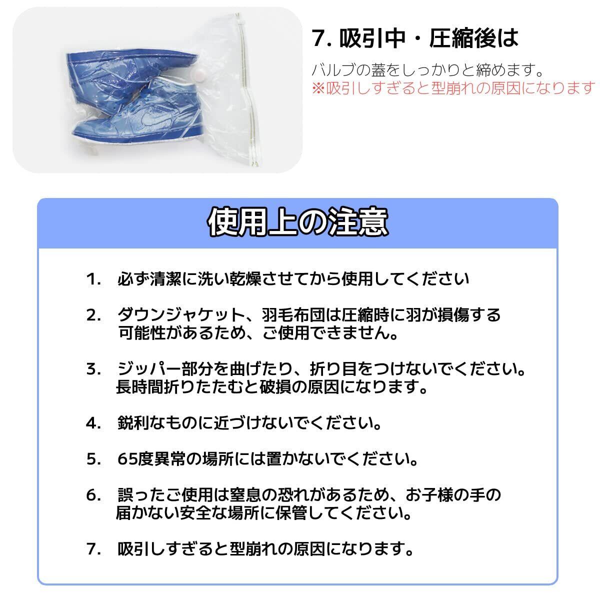 【内容量・サイズ・材質】 圧縮バッグ10枚 圧縮用ポンプ1個 サイズ:50cm x 40cm 材質:圧縮袋-ナイロン 蓋-シリコンバルブ 圧縮ポンプ-ABS ※ご注意 ※必ず清潔に洗い乾燥させてから使用してください 。※ダウンジャケット、羽毛布団は圧縮時に羽が損傷する可能性があるため、ご使用できません。 ※ジッパー部分を曲げたり、折り目をつけないでください。長時間折りたたむと破損の原因になります。※鋭利なものに近づけないでください。 ※65度異常の場所には置かないでください。 ※誤ったご使用は窒息の恐れがあるため、お子様の手の届かない安全な場所に保管してください。 ※吸引しすぎると型崩れの原因になります。