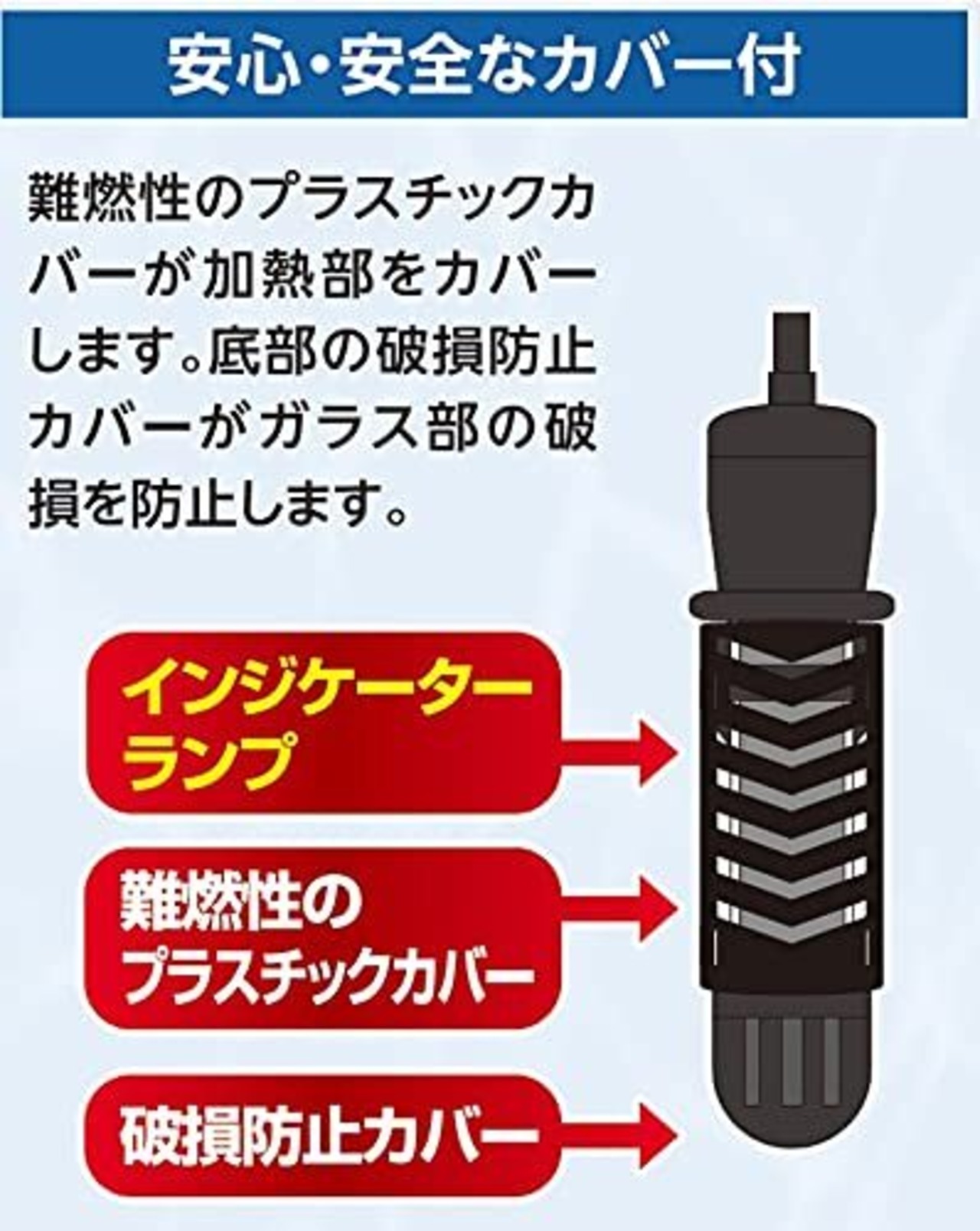 ●自動温度調節器能内蔵なのでサーモスタット不要。水温26℃前後に維持します。●空だき状態が続いて自動温度調節器が故障した場合、温度ヒューズが通電をカットします。(再使用できません。)●難燃性のプラスチッックカバーと、破損防止のためのゴム製カバーの2種類のカバー付きです。