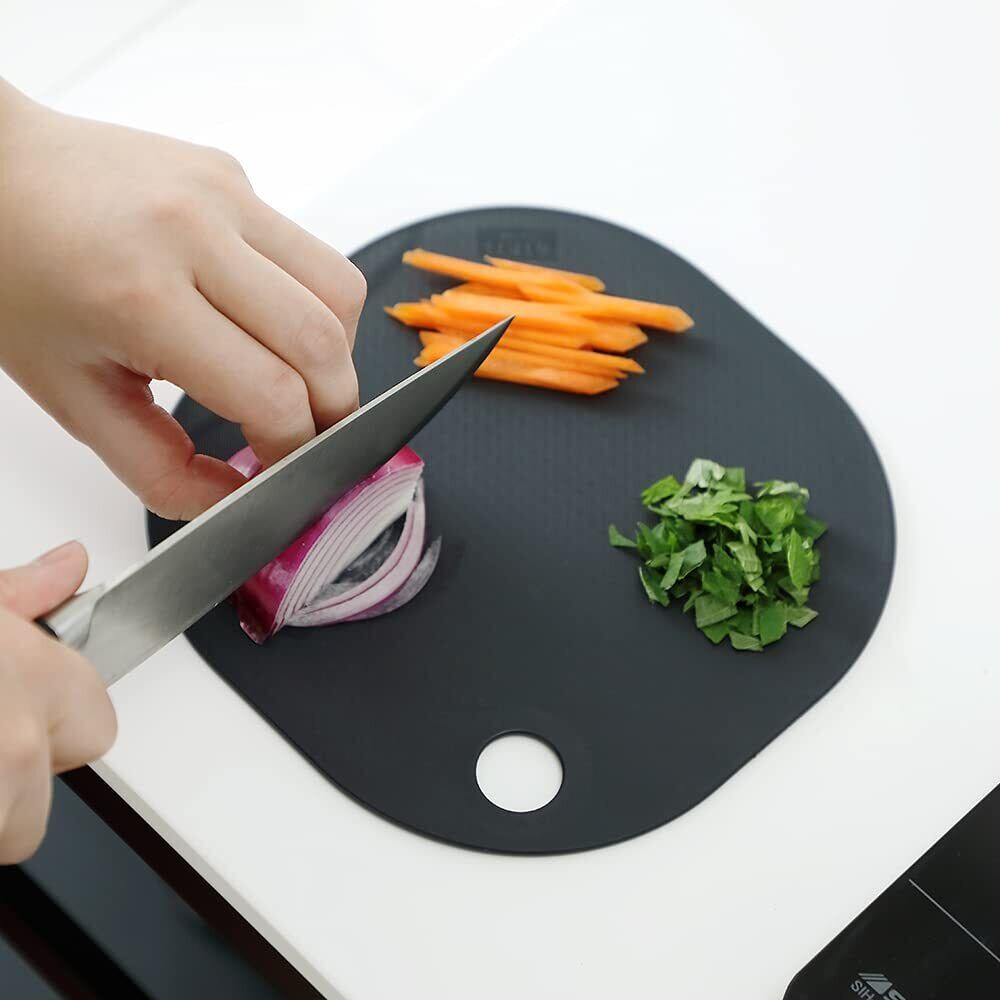 くるくる回しながら違う具材をカットできる丸いまな板と、プライパンやお鍋に移し易い角がある四角いまな板の良いとこ取りの形状。