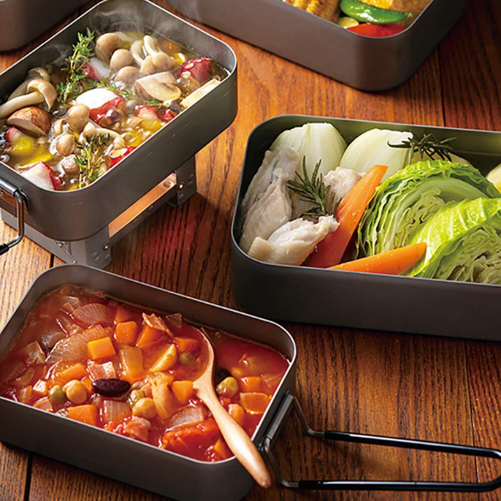 ●丈夫で熱伝導の優れたアルミ製メスティン。●アウトドアやキャンプなどで飯ごう、ハンドルが付いているのでフライパン・鍋などの調理器具として料理を作ることも出来ます。●ハンドルは折り畳んでコンパクトに収納出来ます。計量なので持ち運びに便利。●フタをした際に材料の押し潰れを防ぐふわっとフタ。飯ごう炊飯、焼く、蒸す、煮るのクッキングレシピ付。