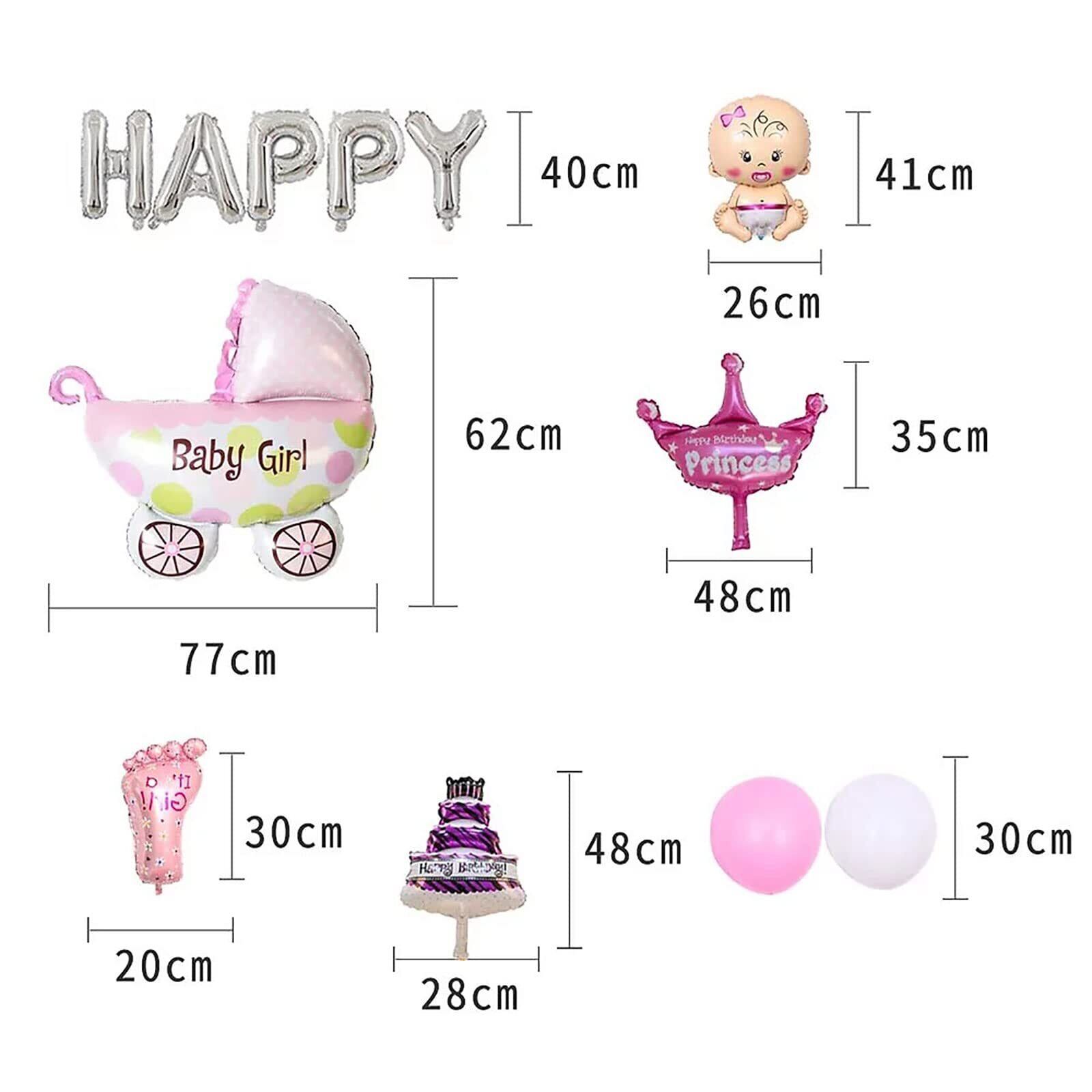 【100日祝い 飾りセット内容】 16インチHAPPY 100 DAYS文字バルーン*1セット, ケーキバルーン*1個, ビッグBABY CAR*1個, BABY バルーン*1個, BABY FOOTバルーン*2個, 王冠バルーン*1個, 12インチピンク風船*10個, 12インチホワイト風船*10個, 5M 糸*1個, 風船専用円テープ100点*1個,