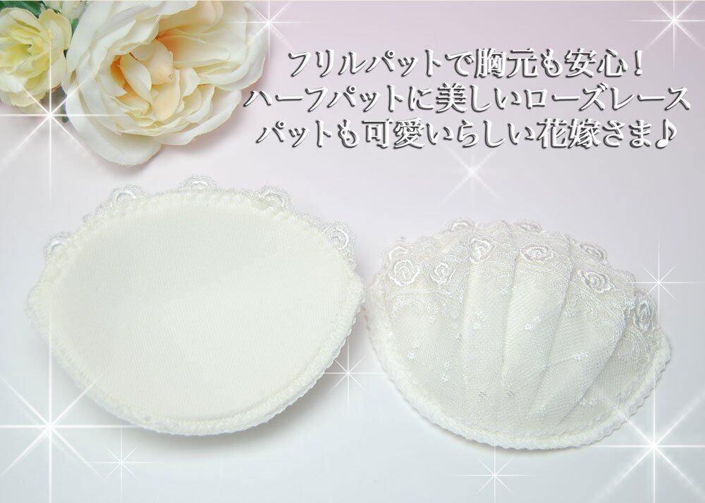 このパットを使えば自然にカップの浮きが無くなります。 ブラのレースとお揃いのバラレースを使用した美しいデザインのパットです。 入場の際など、お辞儀をしてもフリルパットだから、もし見えてしまっても大丈夫です。 胸元を気にせずに安心して過ごせます。 オリジナル商品