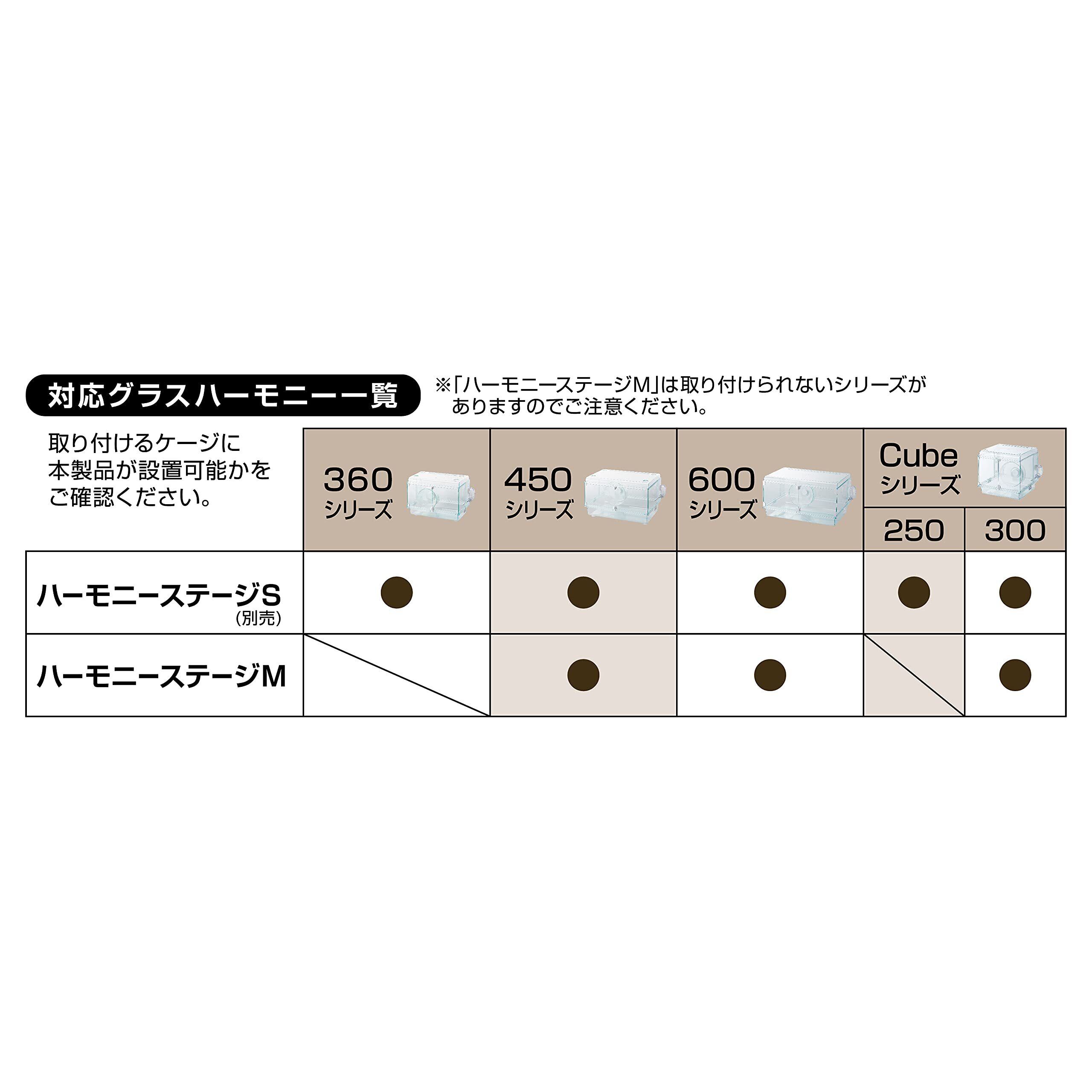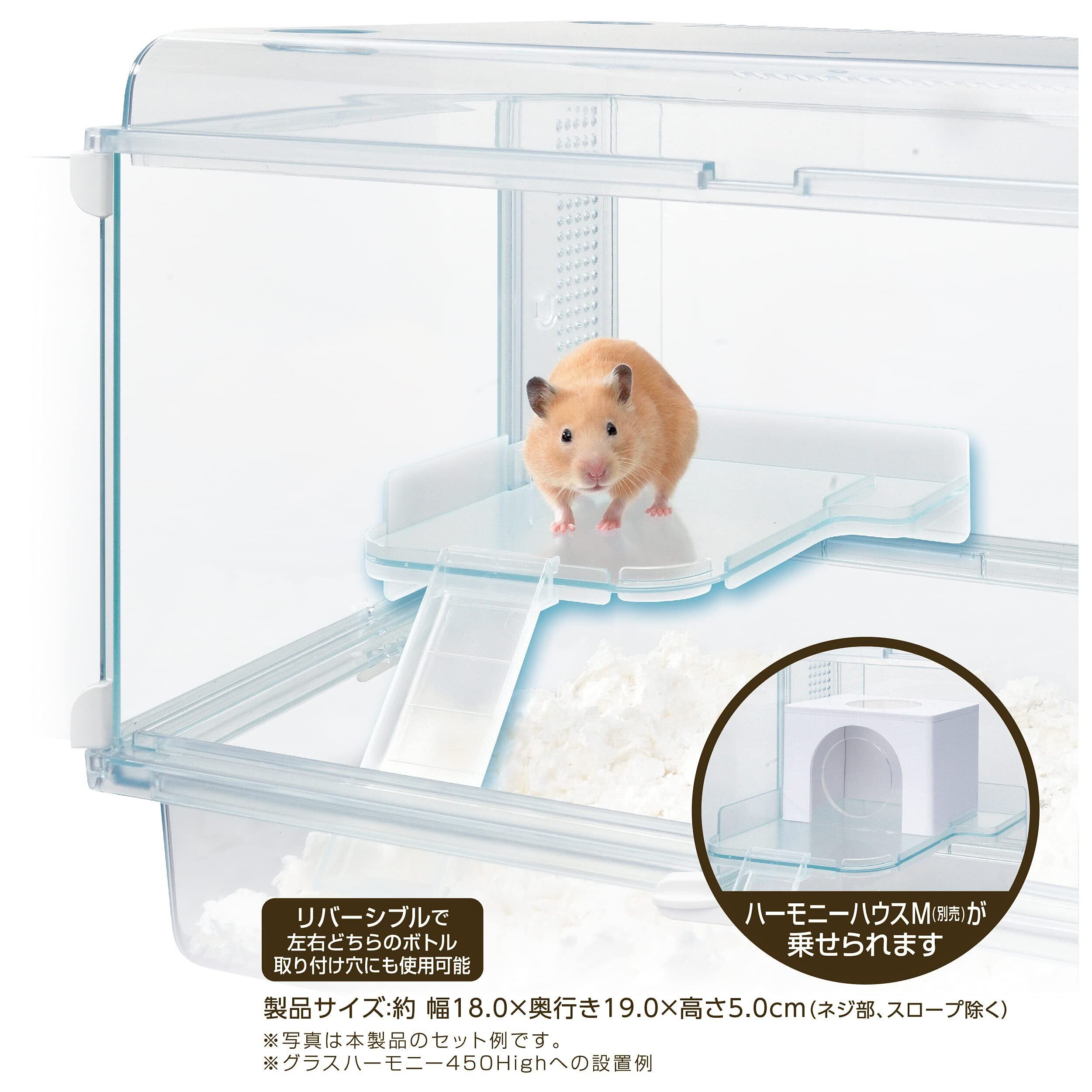 生活空間広がる「ハーモニーステージM」 グラスハーモニー専用ののぼっておりて運動できるステージ! ステージの上には「ハーモニーハウスM」(別売)が乗せられます。ステージの上に「ハーモニーハウスM」を乗せてロフト風に。 「ハーモニーハウスM」(別売)がピッタリ乗せられる、ハウスストッパー付き。 ステージは丸洗いできるのでいつも清潔! リバーシブルでグラスハーモニーの左右どちらのボトル取付け穴に使用可能。 <対応グラスハーモニー>グラスハーモニー450シリーズ、600シリーズ、CUBEシリーズ(300) <ご使用方法>●本製品をケージの中に入れ、付属の部品で固定し取り付けてください。 <製品サイズ>約幅18.0×奥行19.0×高さ5.0cm(ネジ部、スロープ除く) <セット内容>ステージ、スロープ、ゲタ、ネジ