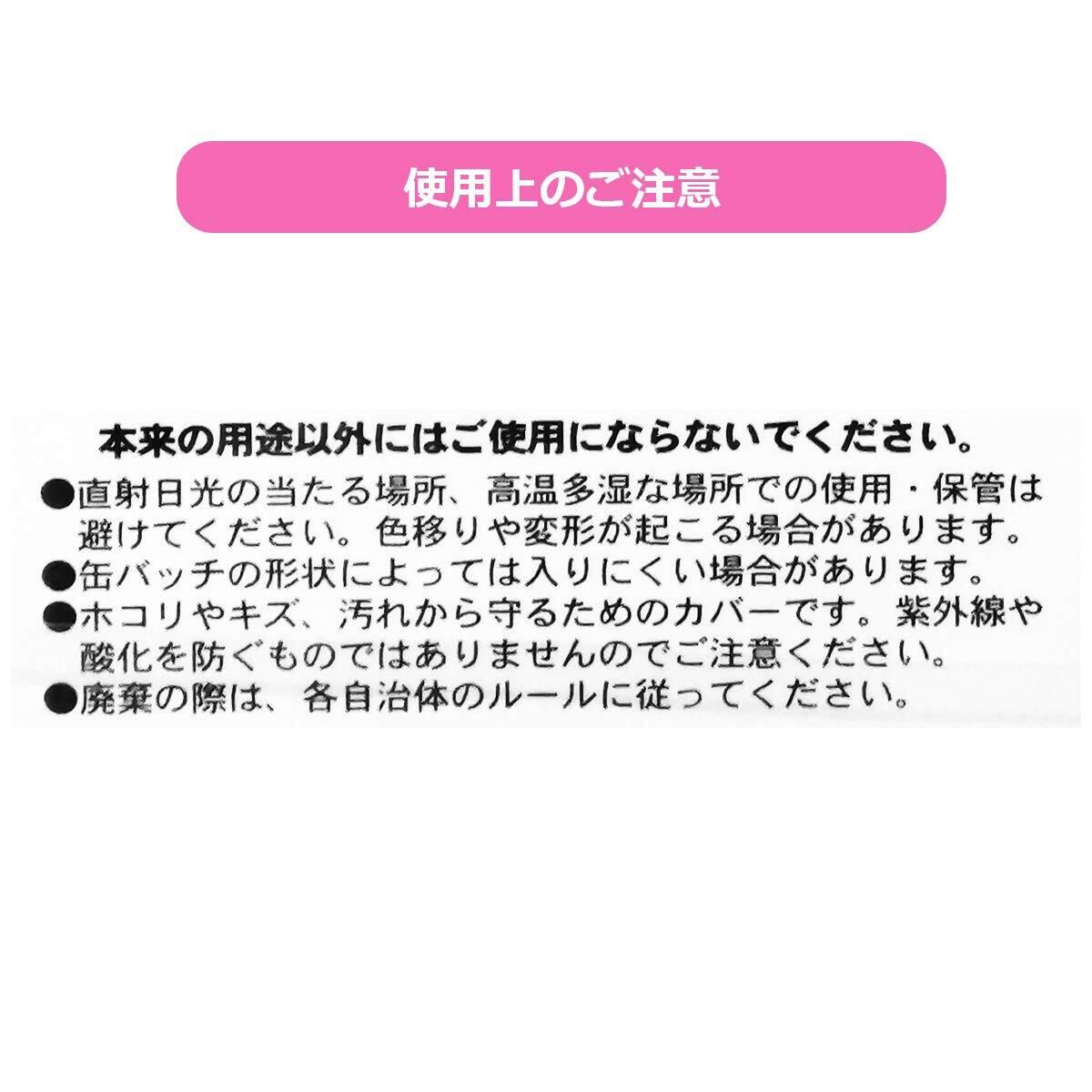 直射日光や高温多湿な場所での使用・保管は避けてください。色移りや変形が起こる場合があります。缶バッジの形状によっては、入りにくい場合があります。紫外線や酸化を防ぐものではありませんので、ご注意ください。廃棄の際は各自治体のルールに従ってください。