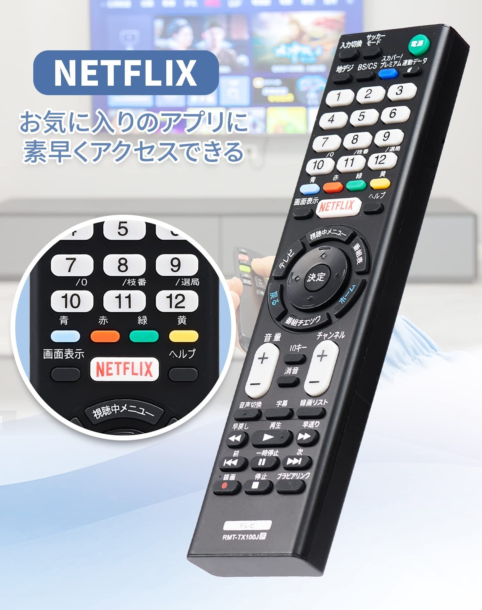 【RMT-TX100Jl交換リモコン】地上・BS/CSデジタルに対応しており、ソニー製の液晶テレビに対応、テレビの電源、音量調節、チャンネル操作が可能です。Netflixなど最新のリモコンボタンを搭載しています。※TVによっては初期設定や動作設定を行うことができません。その場合は、TV付属のリモコンをお使いください。※汎用、マルチリモコンでは使えない機能もご使用いただけます。※2012年以前の機種ではお使い頂けない場合がございます。