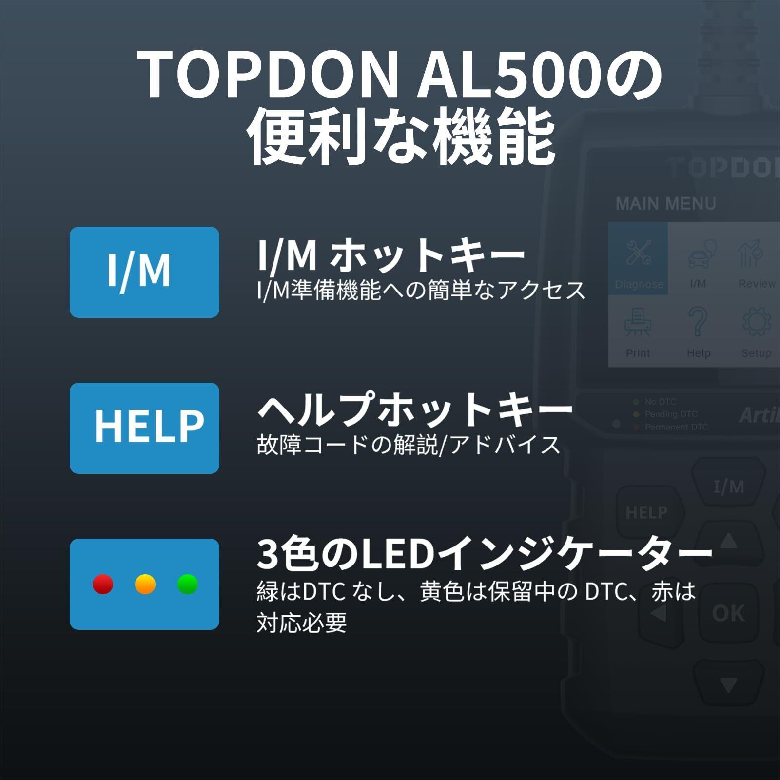TOPDON AL500 obd2 故障診断機 自動車スキャンツール obd2コードリーダー BMW/BENZ/AUDI/VWなど フルobd2機能 OBD2システムの故障コードの読取/消去 チェックエンジンランプの消灯 【日本語表示】