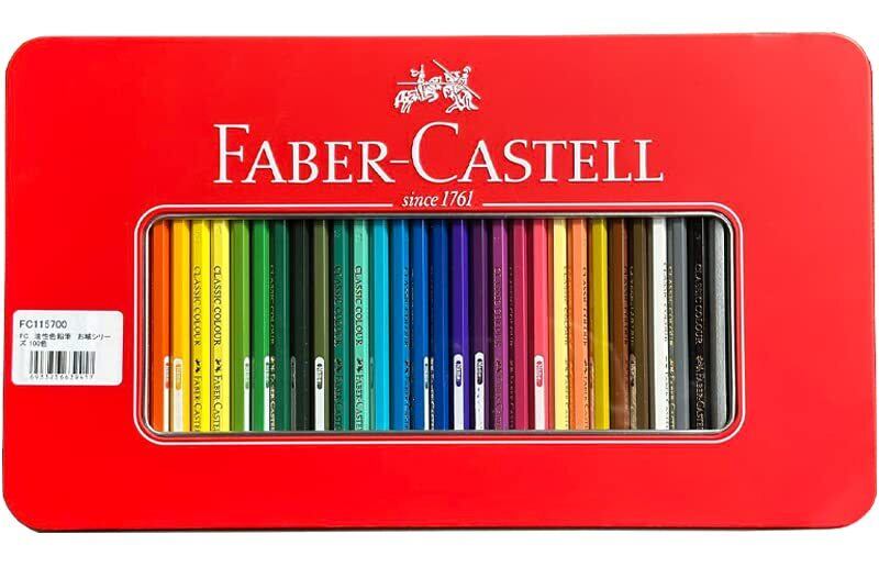 ファーバーカステルはもともとドイツの色鉛筆メーカー。 現在の鉛筆の太さや硬度、長さの国際基準を作ったのもこのファーバーカステルです。 その後、現在では色鉛筆やペン、万年筆など多くの文房具や画材を製造販売している大手メーカーになりました。 描き心地なめらかなファーバーカステル描き心地なめらかな油性色鉛筆、なんと100色の豪華セット。クラシックな絵柄の缶に入った色鉛筆セットなので 届く瞬間には興奮になると思います。ギフトで色鉛筆なら 大変お薦めの一品です。 色の純粋性に優れた高級顔料を厳選し、透明度と彩度の高い色調に設計、堅牢な色芯を包む木軸には、鉛筆材として最良とされているファーバーカステル基準で 喜ばれる一品になります。