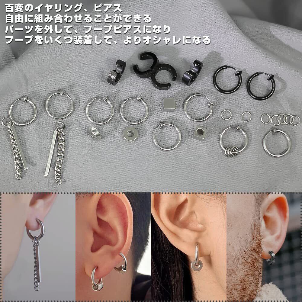 【お得な7ペア&14個セットフェイクピアス】ピアス穴なしでもオシャレに楽しめるフェイクピアスです。7ペア、合計14個で、ピアスのパーツは付けたり、外したりできるし、自由に組み合わせることによって異なるスタイルを楽しめます。イヤリングをペアでつけたり、片耳だけ付けたり、重ね付けたり、軟骨ピアスとして、ブラックととシルバー色違いで付けたりして10個以上の付け方法があります。どんなファッションにも合わせやすく、個性的で自分の魅力さを十分に表せるノンホールピアスメンズです。【プレゼントとして最適】男女兼用で、ペアピアスとしてもおすすめの商品です。自分用にはもちろん、誕生日、クリスマス、記念日など大切な方への贈り物にもおすすめです。