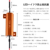 製品仕様: 抵抗値:6Ω / 定格電力:50w / 対応電圧:12V車に対応 / 素材:アルミ(ヒートシンク仕様) / 本体寸法(約):50mm×23mm×15mm×15mm / 配線長さ(約):160mm(片側分) / セット内容:ハイフラ防止抵抗器×2、エレクトロタップ×4