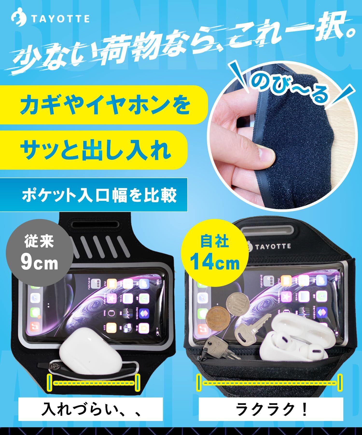 【自分らしいランニング】腕周り19~41cmまでOK。あらゆる人にフィットするアームバンドです。ポケット部分までマジックテープがくっつくから、キツく巻き付けられます。最後まで安心のフィット感で快適なランニングをサポートします!