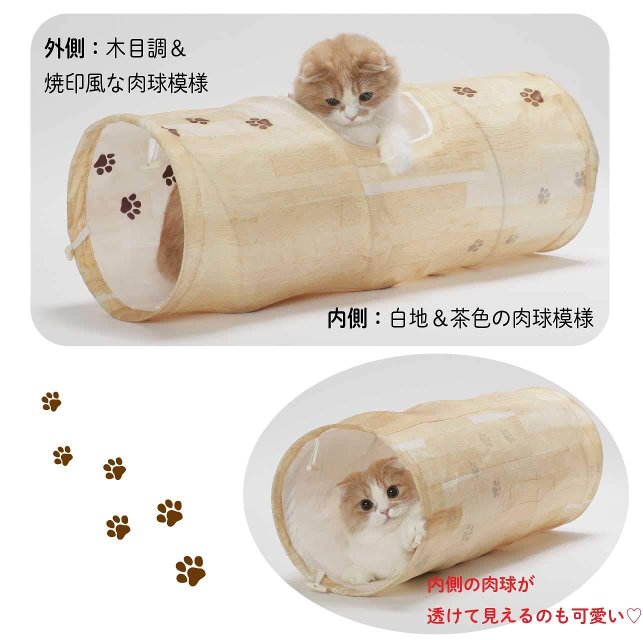 【インテリアの邪魔をしない木目調&内側までかわいい】外側はお家のインテリアを邪魔しない「木目調」にかわいい猫の肉球模様を…。内側の布は白色で、内側にも猫の肉球模様をプラスしました。トンネルの中で遊ぶ猫の写真を取る時にはレフ板効果もあり、写真フレームとしても最適です。