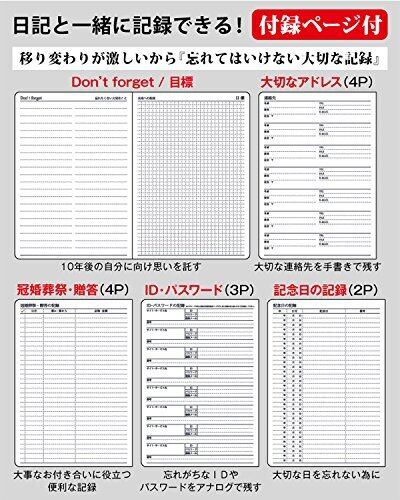 冒頭ページには「忘れたくない事」や「未来への目標」など10年間使い続けるのにふさわしく、