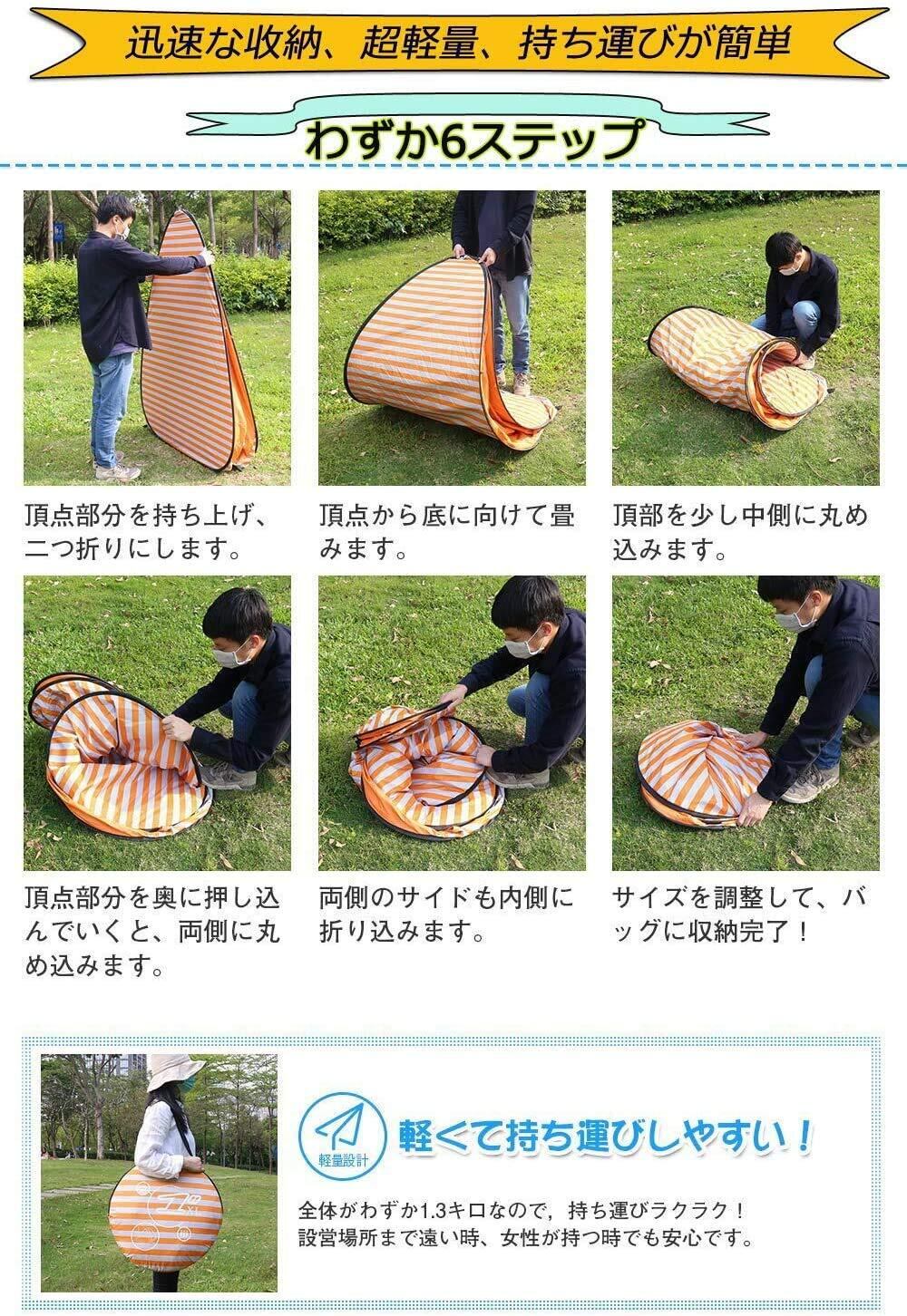 【5秒で出来&組み立て不要】わずか5秒で広かる簡単ポップアップテントです!女性・子供でも簡単に設置ができ。専用キャリーバッグ付きだから、使わない時は折り畳んでコンパクトに収納し、どこでも持ち運びもとっても便利です。