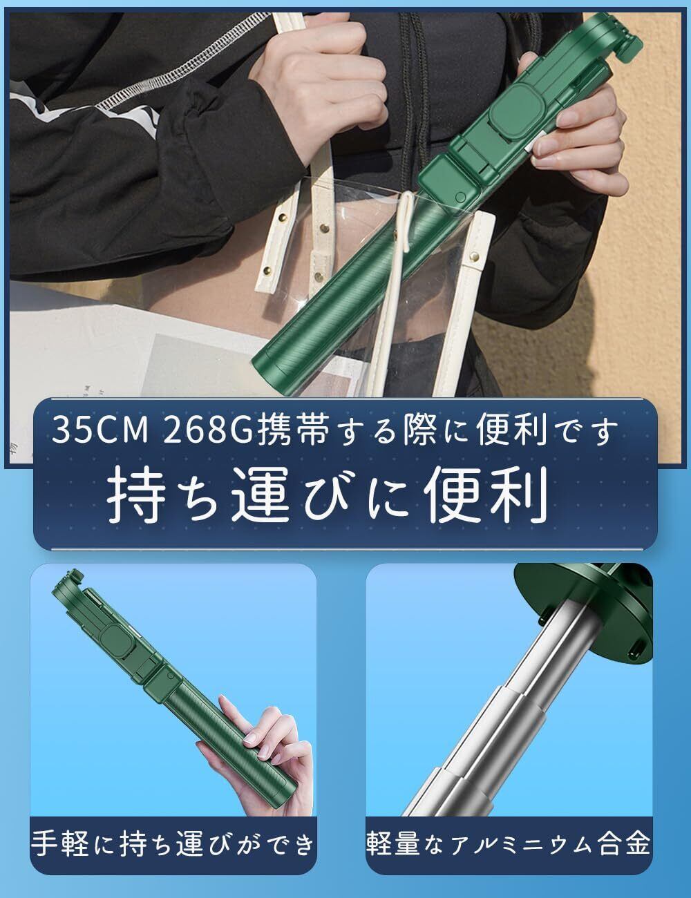 【コンパクで持ち運びやすい 】7段階の伸縮収納方式を採用し、158cmの長さまでに伸びます。折り畳むとわずかの29cmまでコンパクトに収納できます。丈夫なアルミ素材を採用しており、重さは380gです。これ1台あれば、自撮り、集合写真、動画配信などなど いろんなシーンでご利用頂けます。運動会、パレード、イベントなど人が集まる場所で活躍!三脚と一脚を自由変換、撮影、映画放送、TikTok、スマホスタンド、卓上スタンドとしてOKです。ビデオ通話、生放送、Web会議などにも最適です。