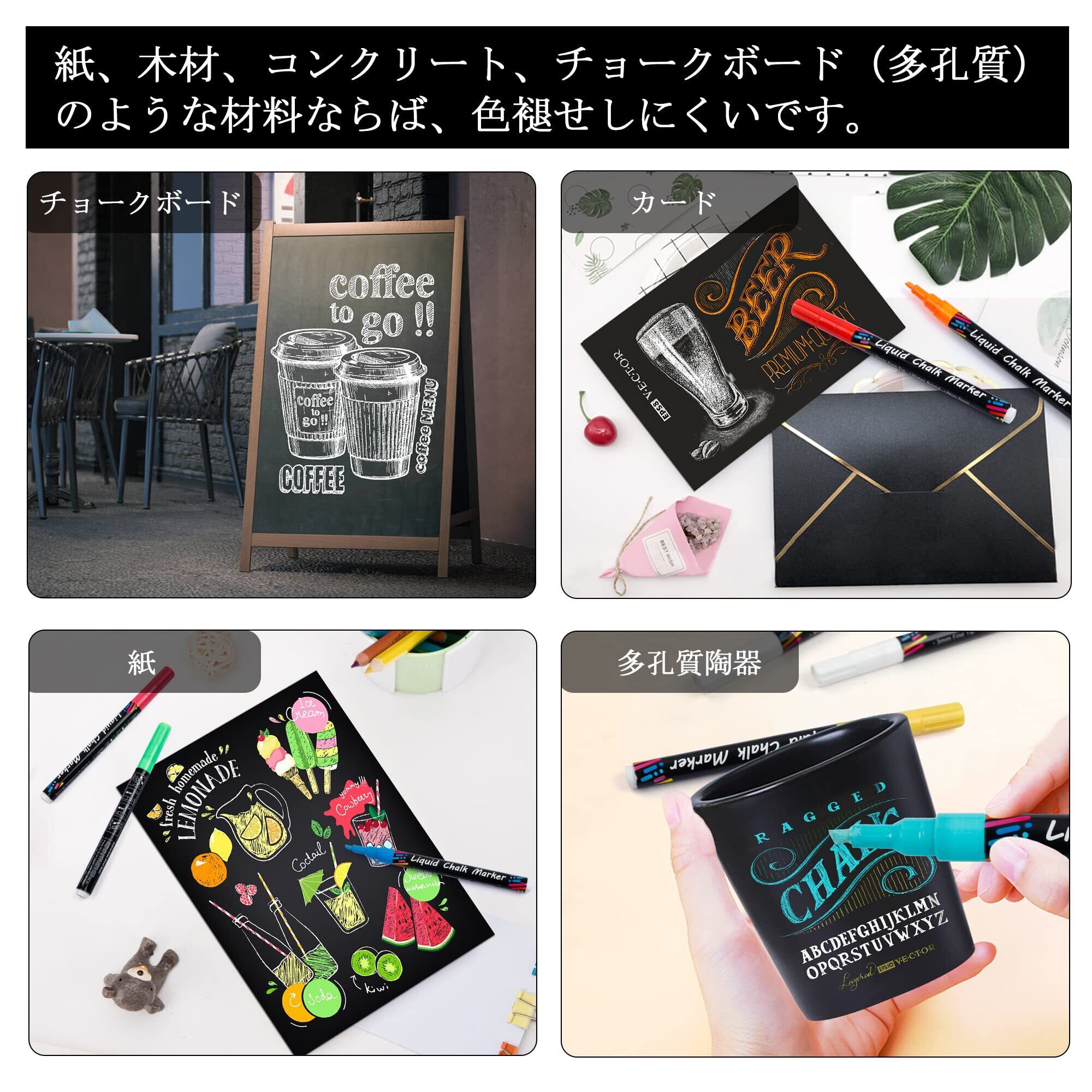 【様々な用途】ブラックボード、ホワイトボート、ガラス、金属、陶器、紙などいろいろな素材に描けます。写真、ポストのような材質にもハッキリと発色します。窓、メニューボード、LED看板に落書きを描き、DIYに最適です。子ども会の景品、知育道具や入園・入学お祝いのプレゼントとしてもオススメです。学校はもちろん、自宅でもオフィスでもお店でも、幅広い場所に利用できます。◎多孔質材料や紙などならば、色残りする場合もありますので、どうかご注意ください。