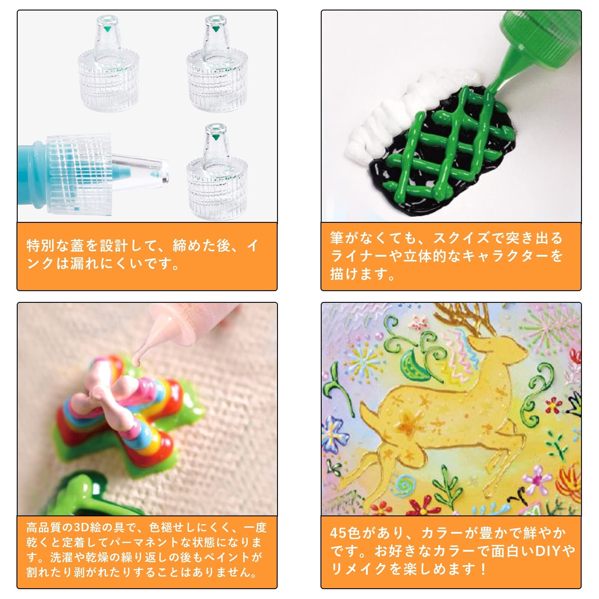 【高品質の3D絵の具】コンパクトなボトルがHDPE材料を使って、開口が精密のデザインで、インク漏れずにスクイズしやすいです。筆は必要なくスクイズで突き出るライナーや立体的なキャラクターを描けますし、発色が鮮やかで、描き心地が滑らかです。色褪せしにくく、一度乾くと水に溶けにくくなり、定着してパーマネントな状態になります。繰り返して乾燥や洗浄した後もペイントが割れたり剥がれたりすることはありません。