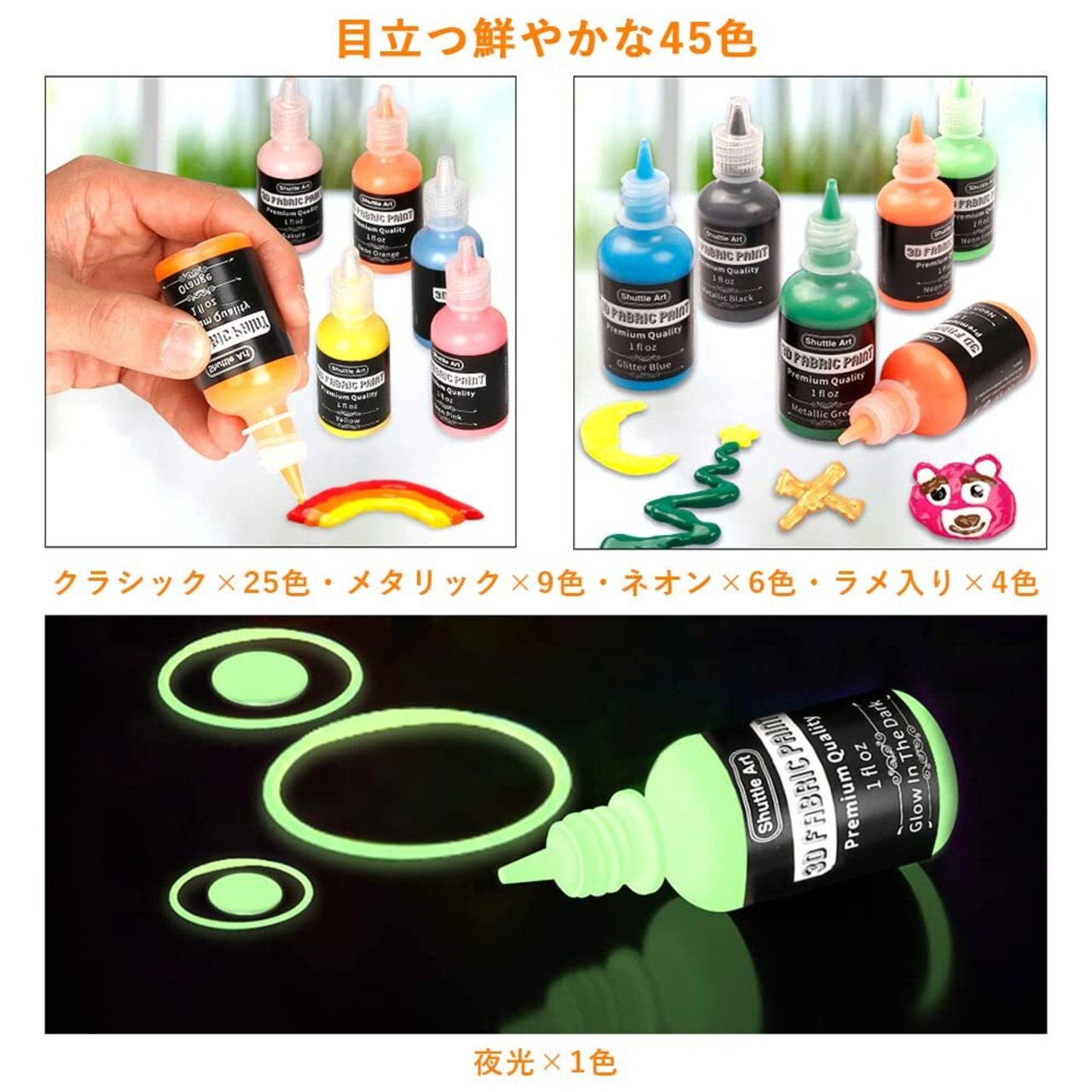【人気商品】Shuttle Art 布用絵の具 3D 立体 45色セット 30ml 布えのぐ ファブリックペイント メタリックカラー ウォッシャブル 洗っても落ちない 耐久 ペイントブラシ・ステンシル・パレット付き DIY イラスト 落書き Tシャツ カンバス スニーカー 子供 プレゼント | Premium Stage