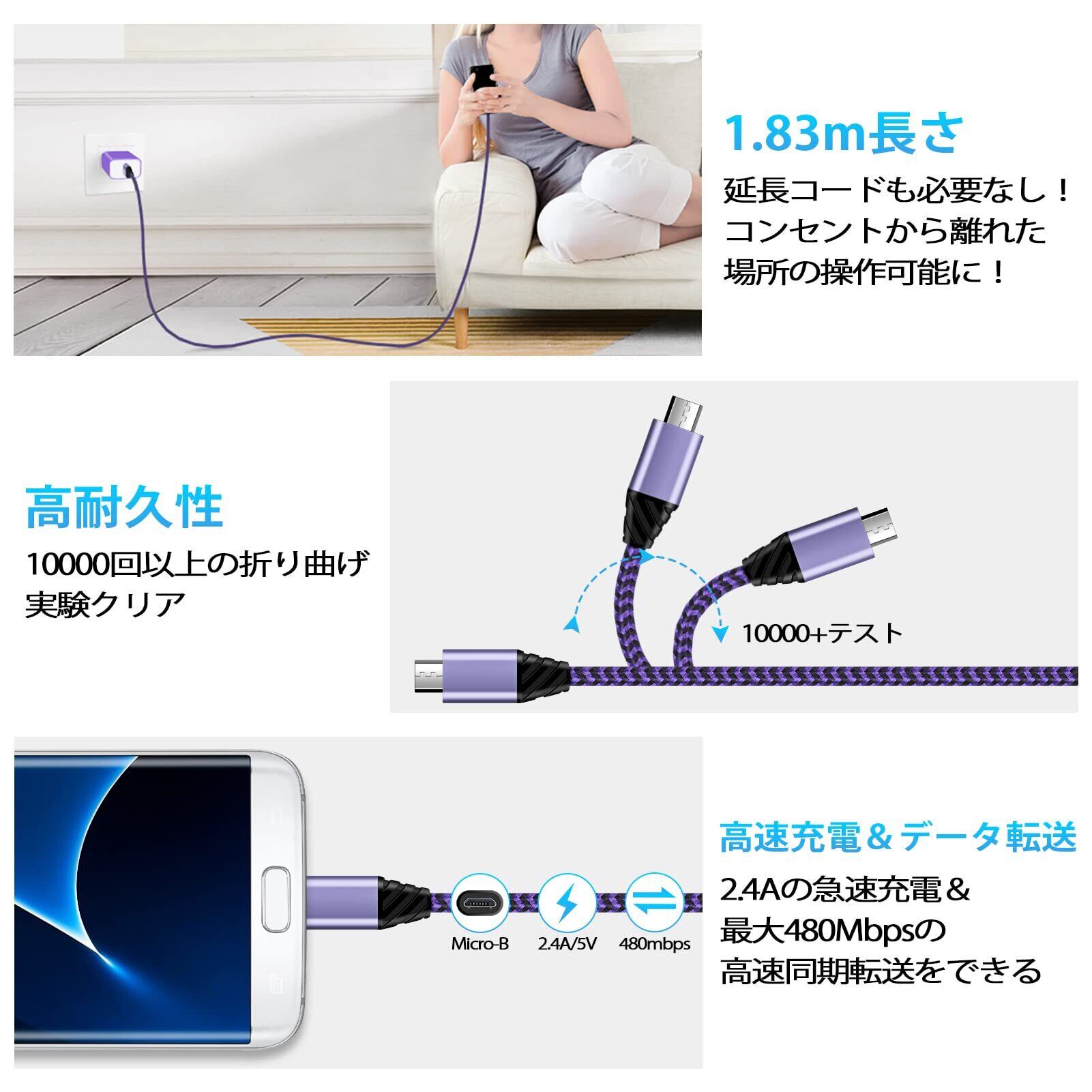 ChrisPow アンドロイド充電器 マイクロusbケーブル Micro B【 1.83m/1本 18W qc3.0対応 2.4A出力】usb急速充電器 Android充電器 充電ケーブルタイプb micro スマホ充電器 マイクロb usbケーブル qc3.0アダプター type bケーブル 携帯充電器 usb充電器 type b acアダプター タイプb電源コード ps4ケーブル usbコンセント usb電源アダプタRedmi 12C Aquos Xperia Fujitsu Arrows Asus ZenFone Huawei Galaxy S10 S9 S8 S7 S6 Edge A6 J8 J5, LG V10 G4 G3 K30 K20 Google Nexus 6, HTC One M8, Galaxy Note 5, LG G4(パープル)