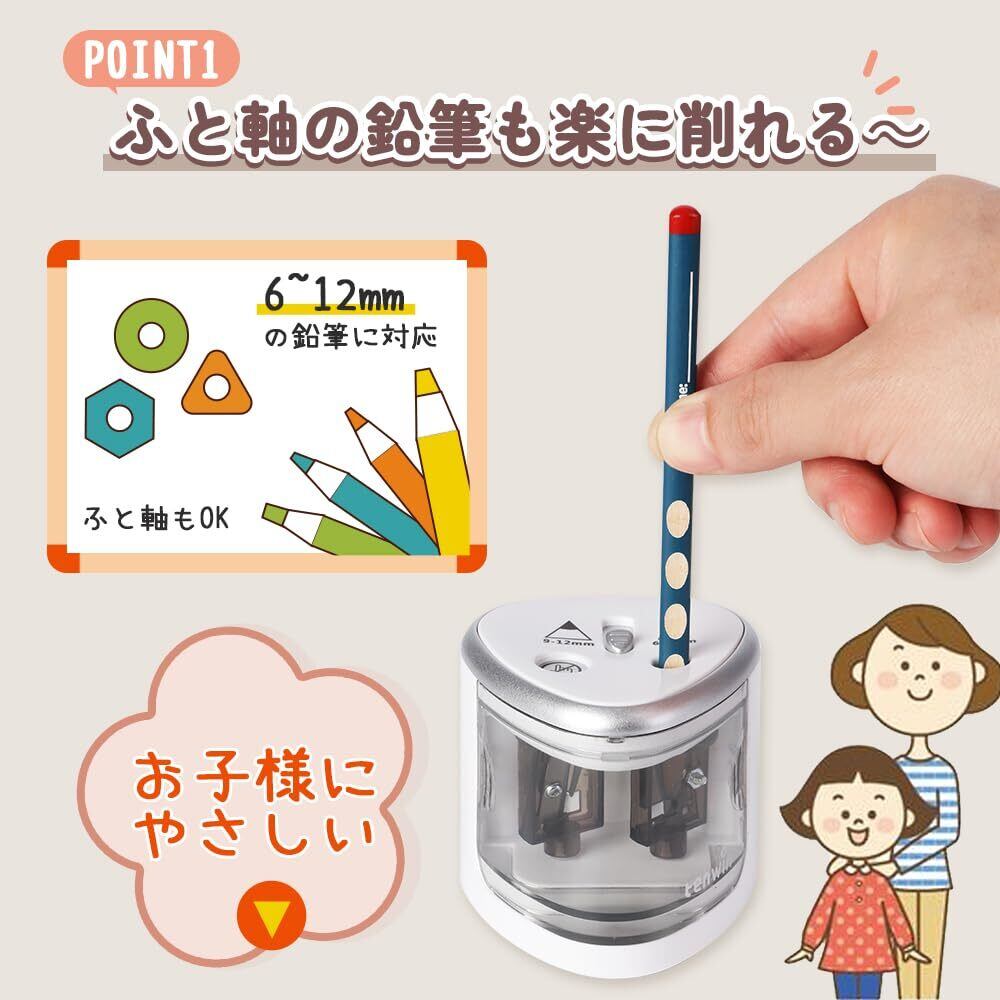 Tenwin 電動鉛筆削り 電動シャープナー 人気 小型 コンパクト 軽量 コードレス 2穴タイプ6-12mm鉛筆適用 単三電池対応 太軸対応 6つの安全機能搭載 無駄削り防止 学習用 子ども 大人 入学祝い 誕生日プレゼント ホワイト