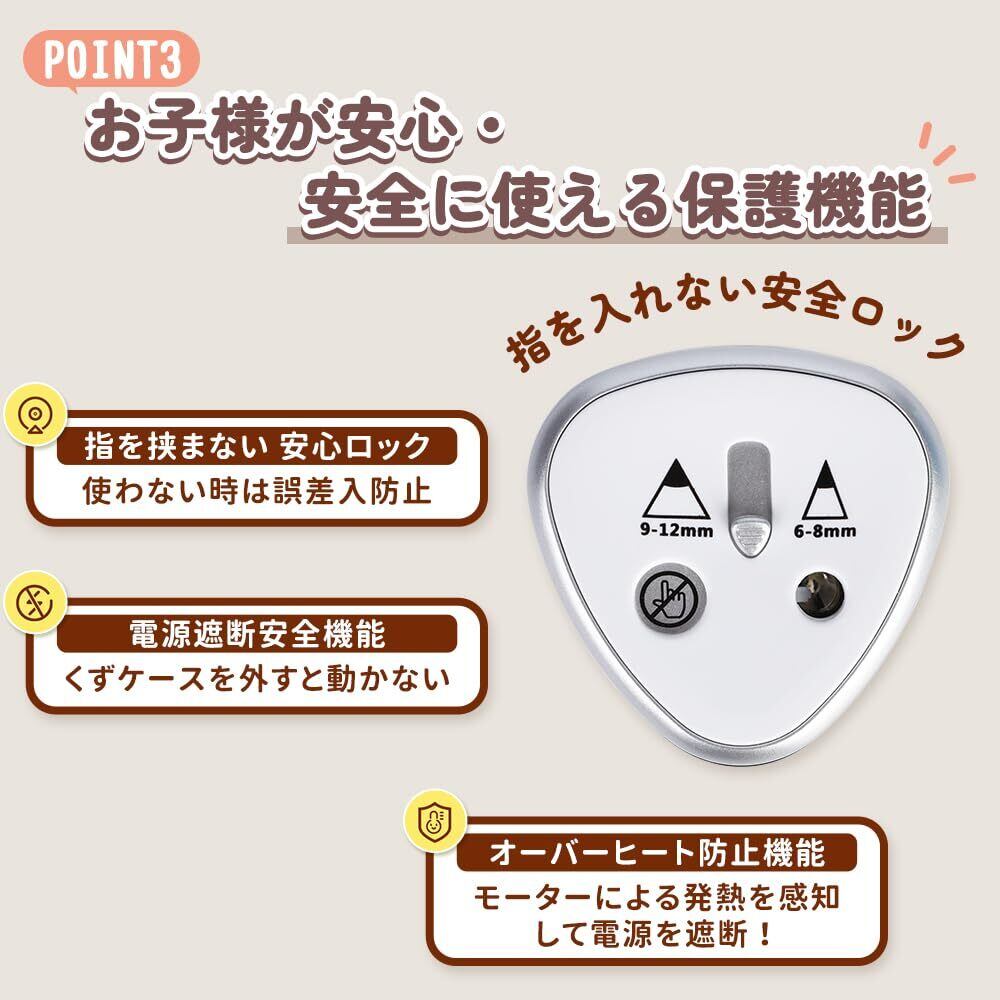 【お子様に安心・快適な6つの安全機能】 ①「スピード削り機能」で3秒で芯先を尖らせ、時間を節約。 ②「無駄削り防止機能」で芯が尖ったことを感知し、自動で削るのを停止。 ③「安全オートストッパー機能」で削りくずケースを外すと作動しない安心設計。 ④削りくずの溜まり具合が分かる「透明ケース」。 ⑤太軸専用穴に指が入らない「安全ロック付き」。 ⑥片手で持ち運びやすい「ミニサイズ設計」。 これらの機能により、お子様が毎日安全かつ快適に使えます。