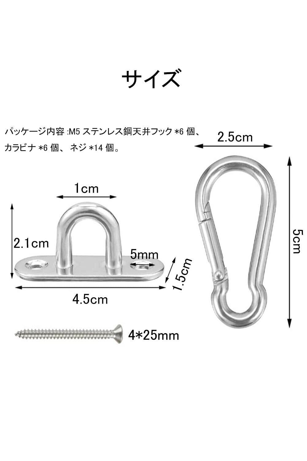 【パッケージ内容】M5ステンレス鋼天井フック*6個、カラビナ*6個、ネジ*14個。