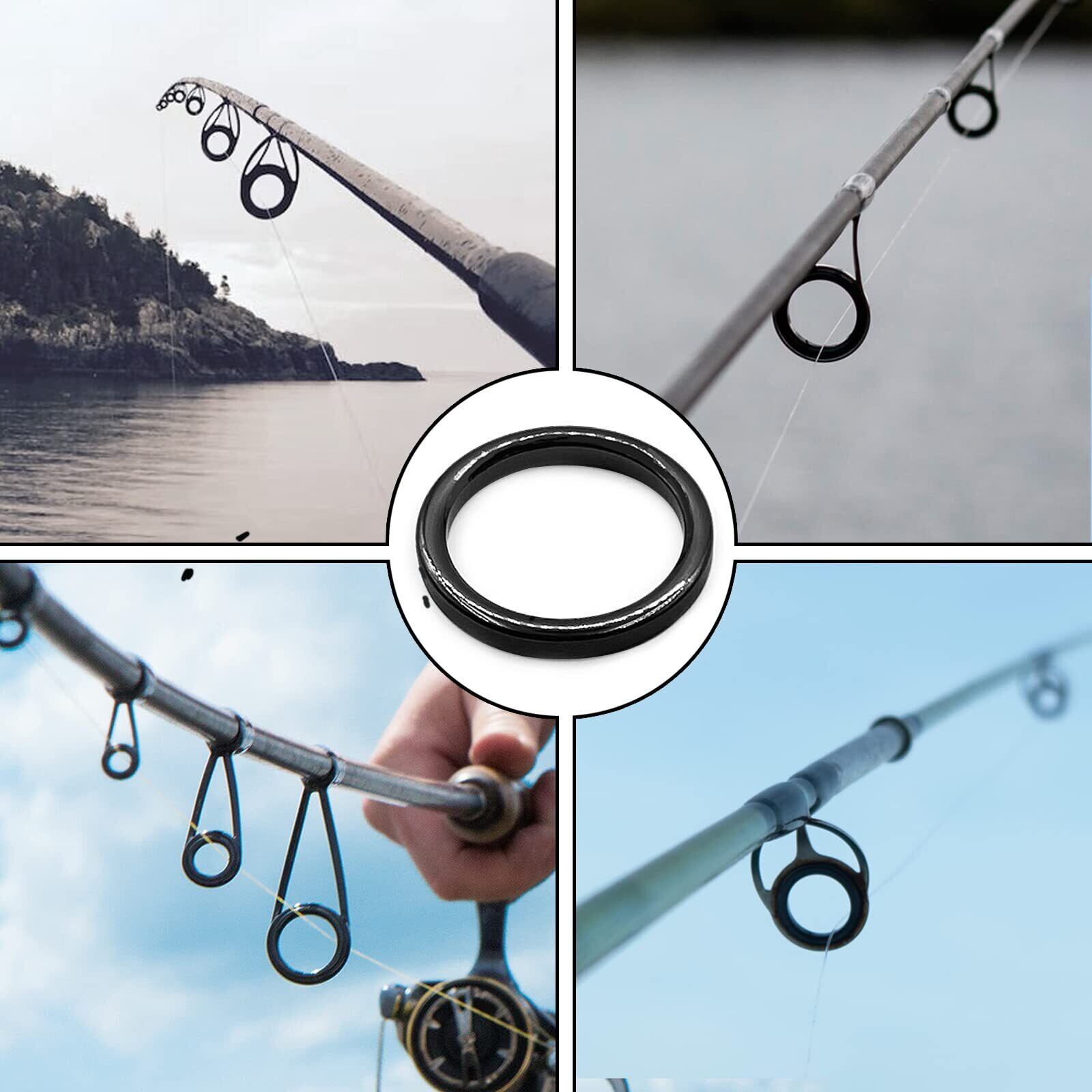 【釣り糸を守る】内輪が滑らかなセラミックリングは、磨耗による釣り糸の破断リスクを大幅に低減します。 外輪の表面が粗いため、取り付けが容易で、ガイドリングとより強固に密着し、簡単に脱落することはありません。