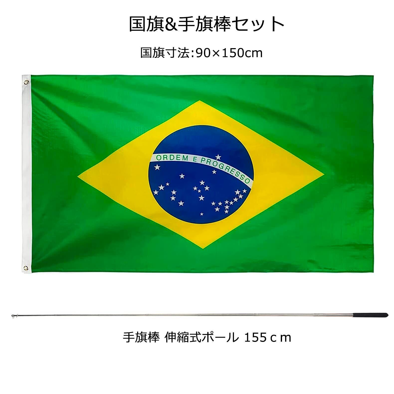 Difounmas 国旗セット ブラジル国旗 旗棒 伸縮式 フラッグサイズ 90×150cm 伸縮旗ポール 手旗棒 155cm 国際交流 フェスティバル イベント サッカー 体育 競技 代表応援用 文化祭 装飾 パーティ運動会用