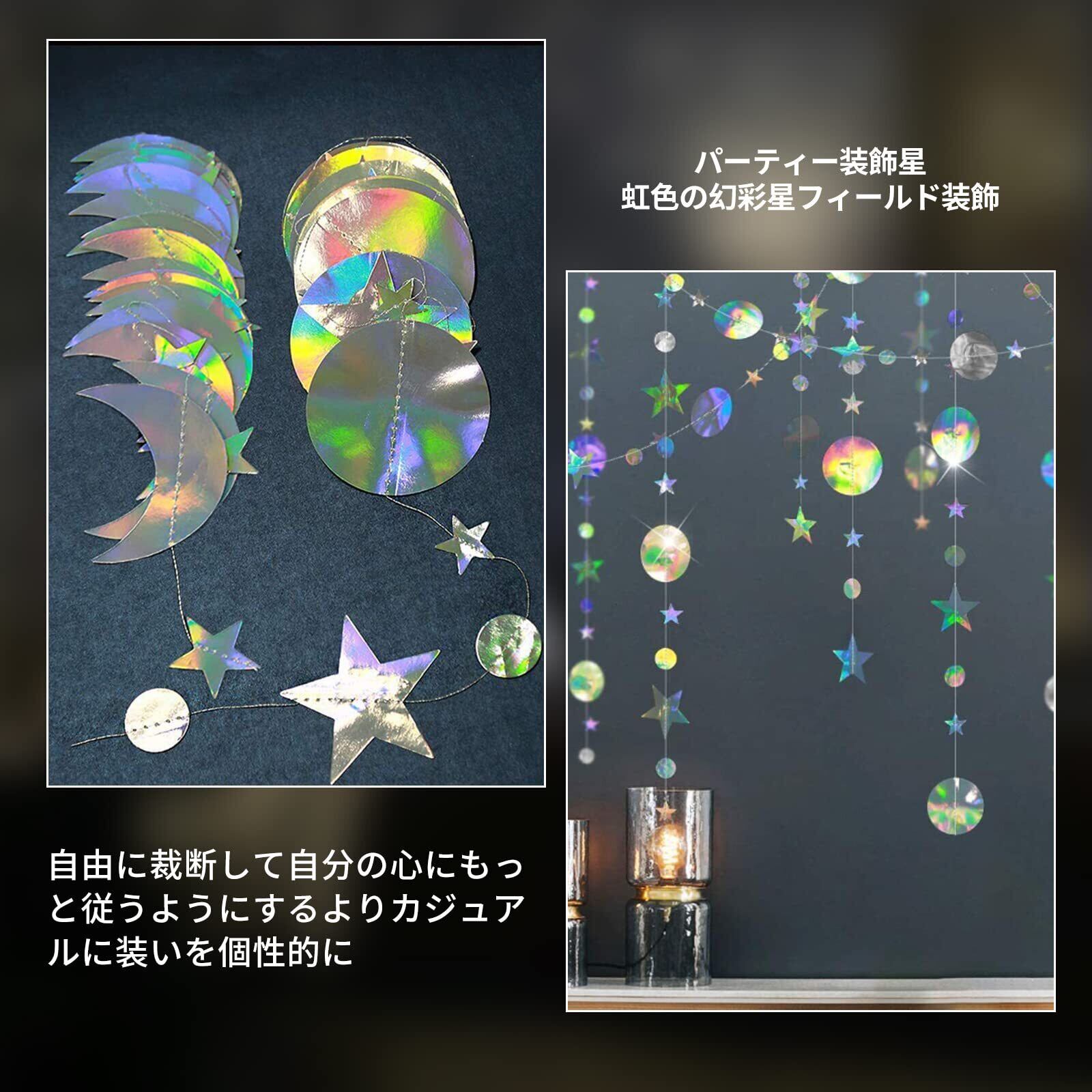 【ガーランド】これらの奇妙でカラフルな星のペンダントはユニークなデザインで、家庭やパーティーの絶好の装飾です。虹の新月と星形のドットパーティーの装飾花輪は丁寧に手作りされ、銀糸機で縫われています。両面3D金属紙で、切断が整然としており、丈夫で、糸が外れたり切れたりしにくい。耐久性があり、再利用可能です。