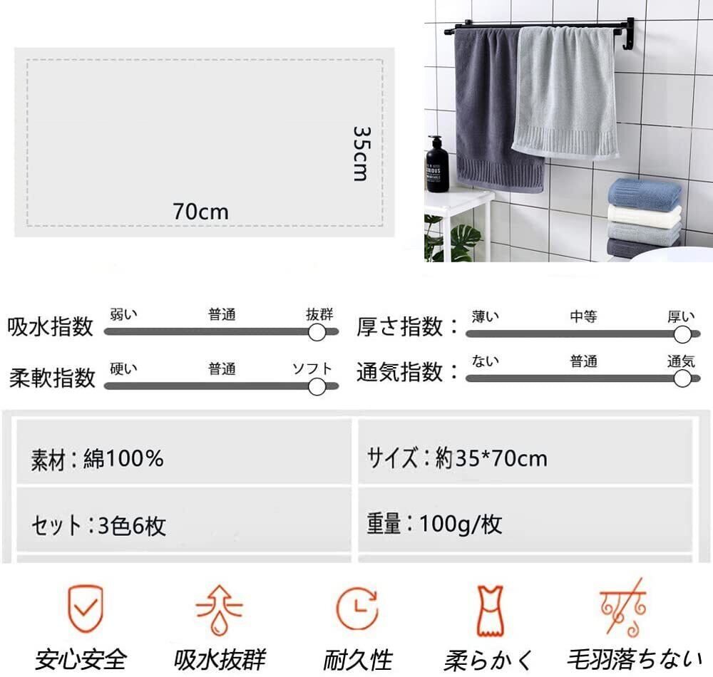 【フェイスタオル 6枚セット】素材:綿100%、サイズ:約35×70cm、重さ:約100g(1枚)、セット内容: ホワイト2枚 、ブルー2枚、グレー2枚。