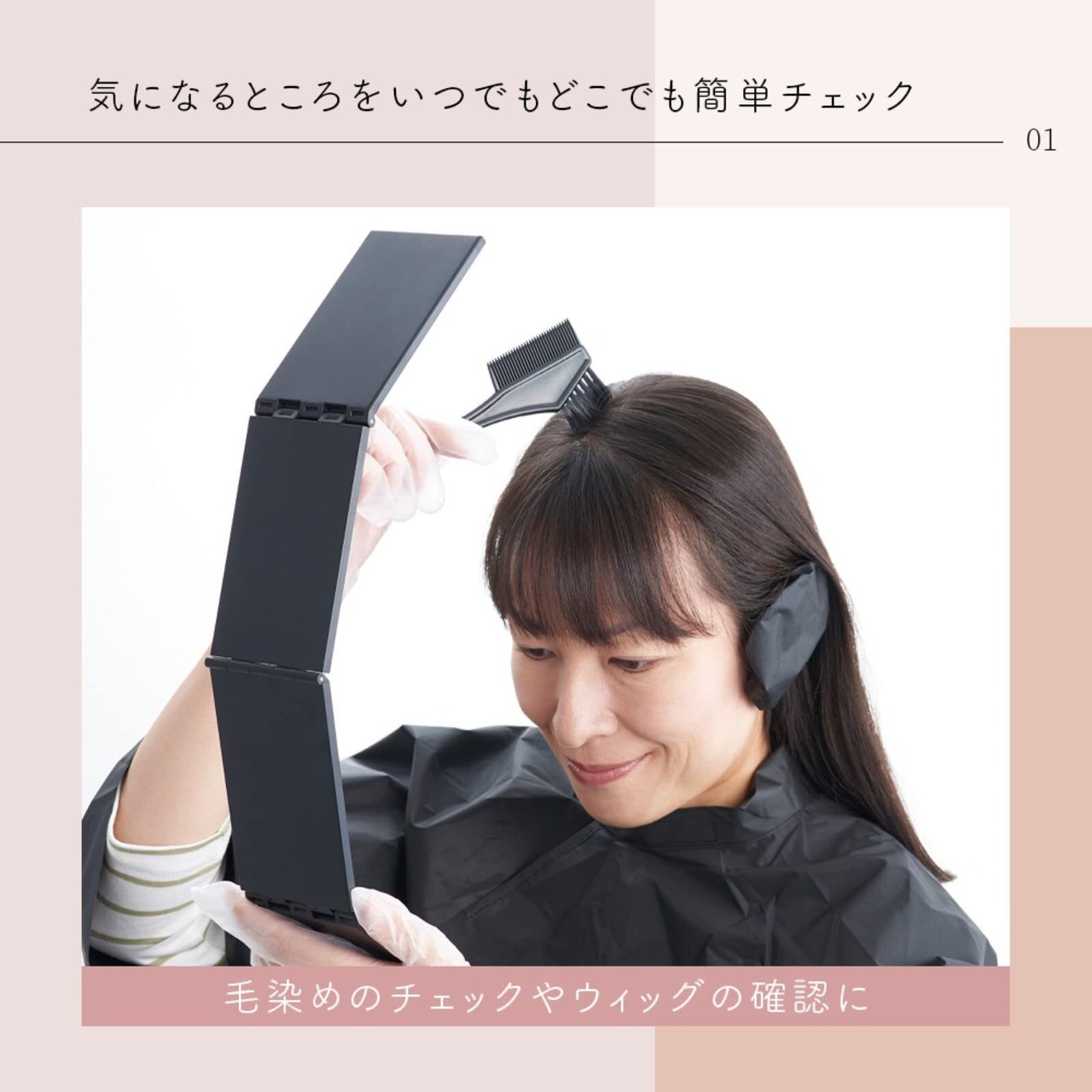 見えにくいところを簡単チェック!目頭から目尻までメイクバランスをしっかりチェック!頭頂部も簡単に見れて白髪チェック、毛染めやウィッグの確認に最適!折りたたんでスタンドミラーにも早変わり!襟足のうぶ毛剃りや耳そうじなど普段見えにくいところも確認できる。
