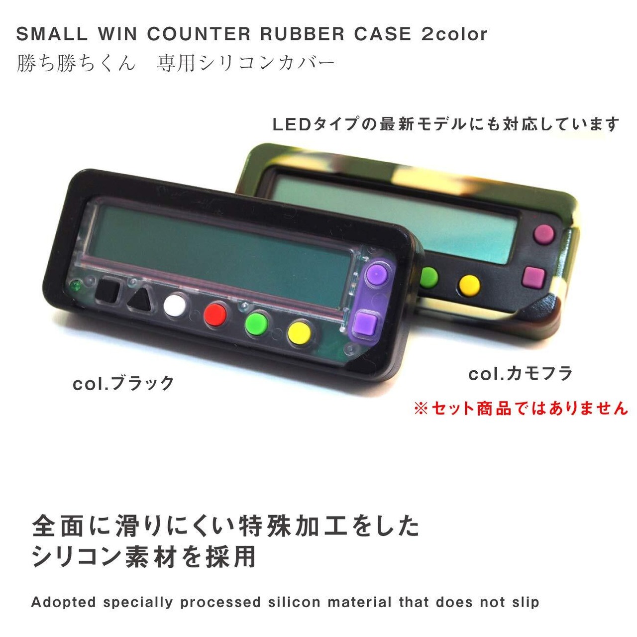 パチスロ小役カウンター「勝ち勝ちくん」専用のシリコンカバーです。専用設計なのでピッタリフィットします。また、各操作ボタンも押しやすいようにカッティングされており、使いやすく、表面は滑りにくい加工をしていますので、遊技台に置いてご使用される際も便利なアイテムです。最新のLEDバージョンにも対応していますので、LEDライトもバッチリ確認できます。背面の電池カバーは使い込むと外れやすくテープなどを貼っている方も多いはず(笑)そんなお悩みも解決できる優れもので、電池カバー部分はしっかりガードしています。快適なパチスロライフを楽しむためのマストアイテムです!カモフラカラーに加えて新色のブラックも登場!
