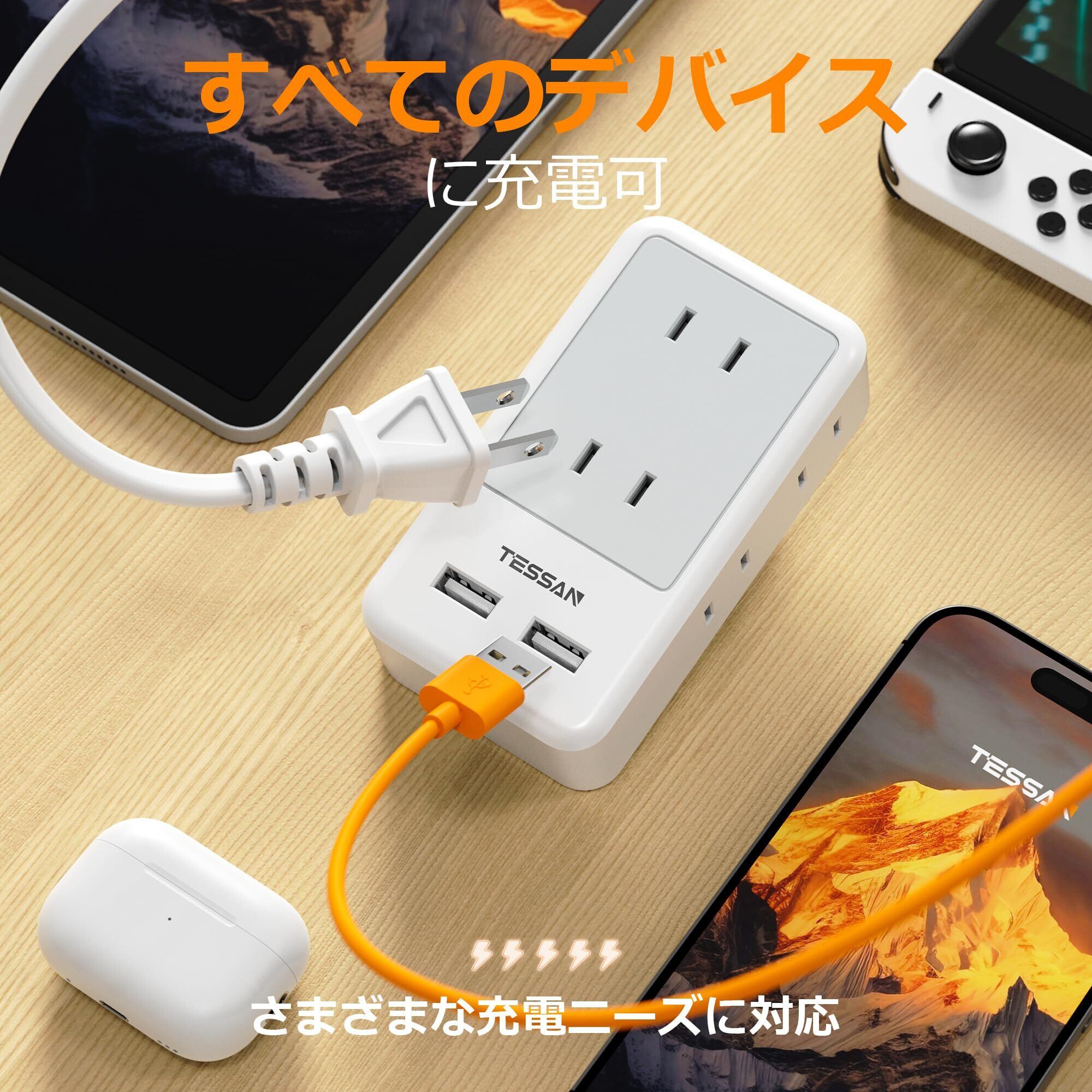 コンセントタップ 電源タップ usb付き 6個AC口 2つUSB-AポートTESSAN たこあしコンセント タコ足配線 マルチタップ 充電タップ 雷ガード 小型
