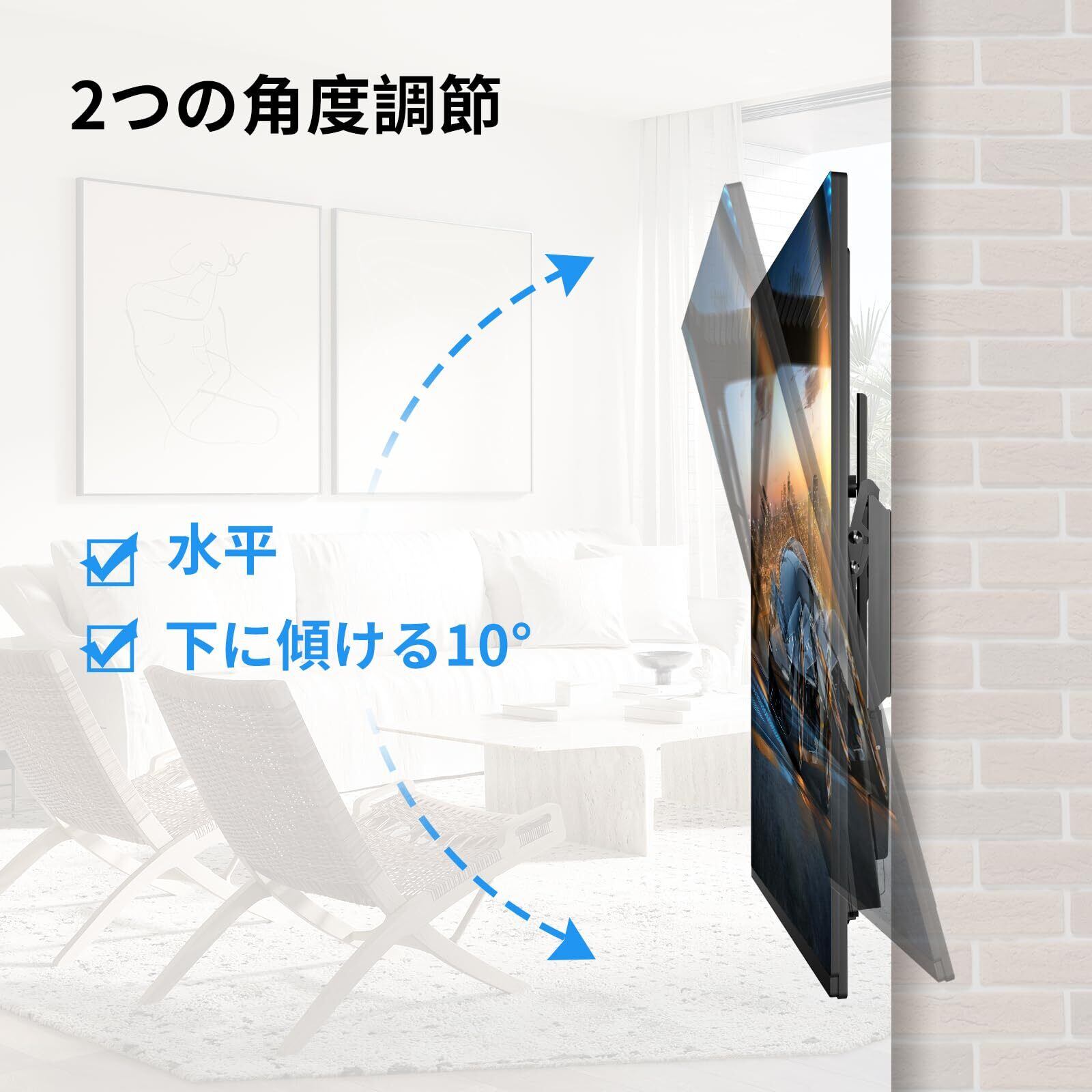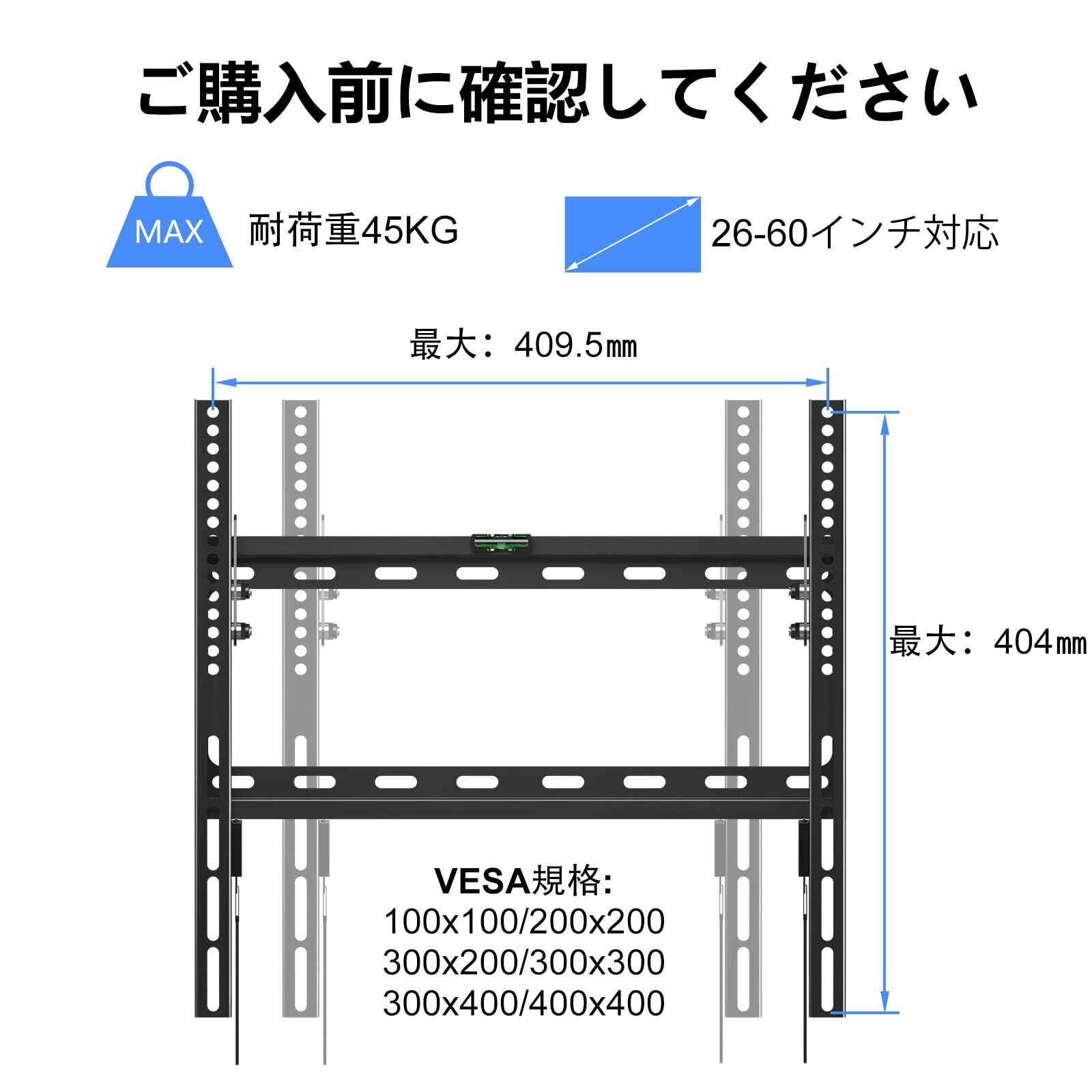 【対応機種-汎用壁掛けテレビ金具】耐荷重は45KGで、26~60インチまでのテレビが壁掛け可能です。テレビ用ブラケットはVESA100×100mm、200×200mm、300×200mm、300×300mm、300×400mm、400×400mmに対応しています。適用Sony bravia(ソニーブラビア)、SONY ma×zen、Hisense(ハイセンス)、Toshiba Regza(東芝レグザ)、Panasonic Viera(パナソニックビエラ)、Sharp Aquos(シャープアクオス)、日立(HITACHI)、三菱(REAL)、LG エレクトロニ、TCL、山善(YAMAZEN)液晶 テレビ用。※ご注意:乾式壁・石膏ボードのみへの設置はお止めください!木間柱壁の場合は、アンカーを使用しないでください。