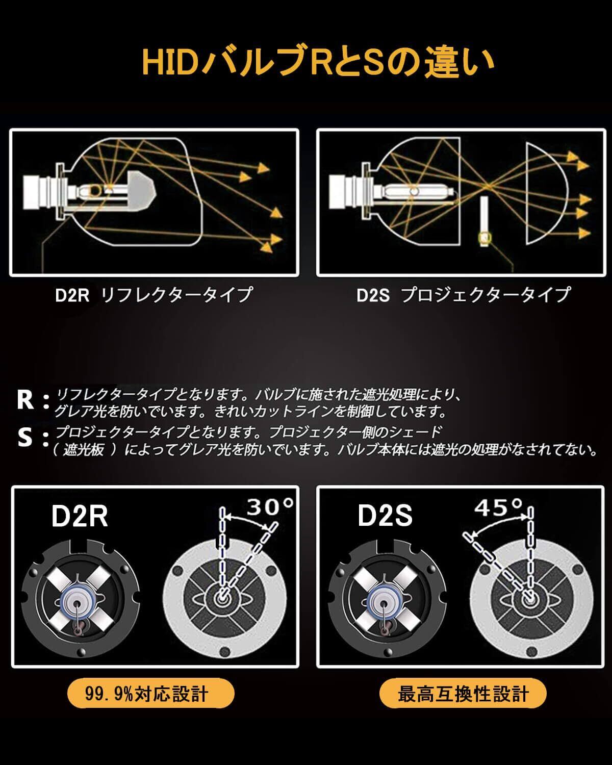 発光抜群 と 明るいの HID電球: 高純度99.99%のキセノンを採用する、純正HID D2S 6000K(ホワイト)素早い立ち上がりと安定した光量、透き通る高品質の光を生み出す当店のバルブ。くっきりとしたカットオフラインを形成し、対向車における眩しさにも配慮した設計。純正HIDと同形状のスレンダーヘッドで、独特の存在感をかもし出す美しいフォルムを実現しました。ハロゲンランプや通常のHID電球に比べて視認性を大幅に高めている、最適な配光を実現、光の射距離はさらに長い。