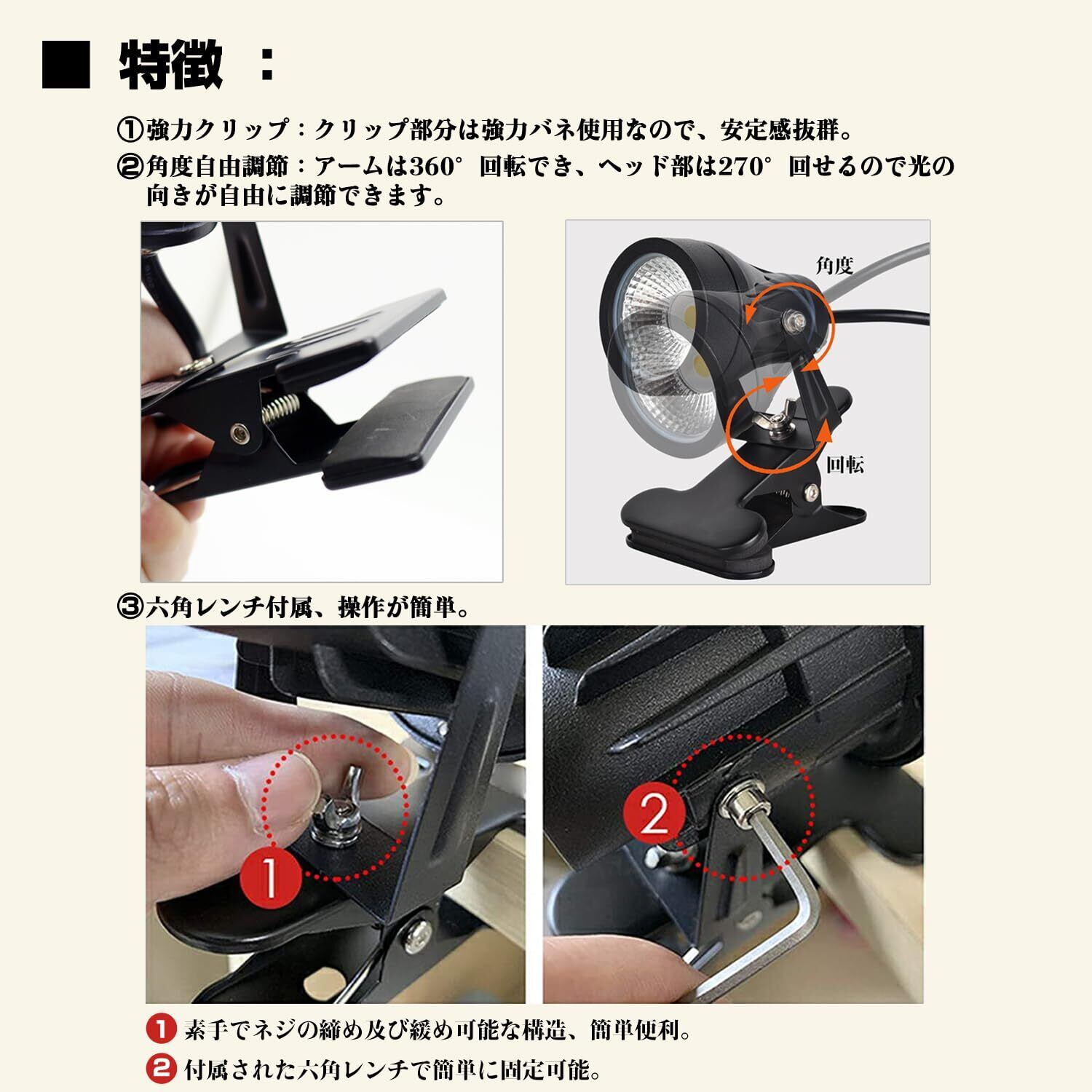 【屋外、屋内使用可能】防雨タイプの9WLEDが一体型になったクリップライトです、看板や屋外、倉庫などの作業用に最適な。ライトの上下多角度を調整出来るようになっていますので、とても便利です!ライトをしっかり支えるクリップがついているので、看板や板などを挟んで使えます。さらに、屋内で花、植物、装飾品を照らして雰囲気を調整することもできます。