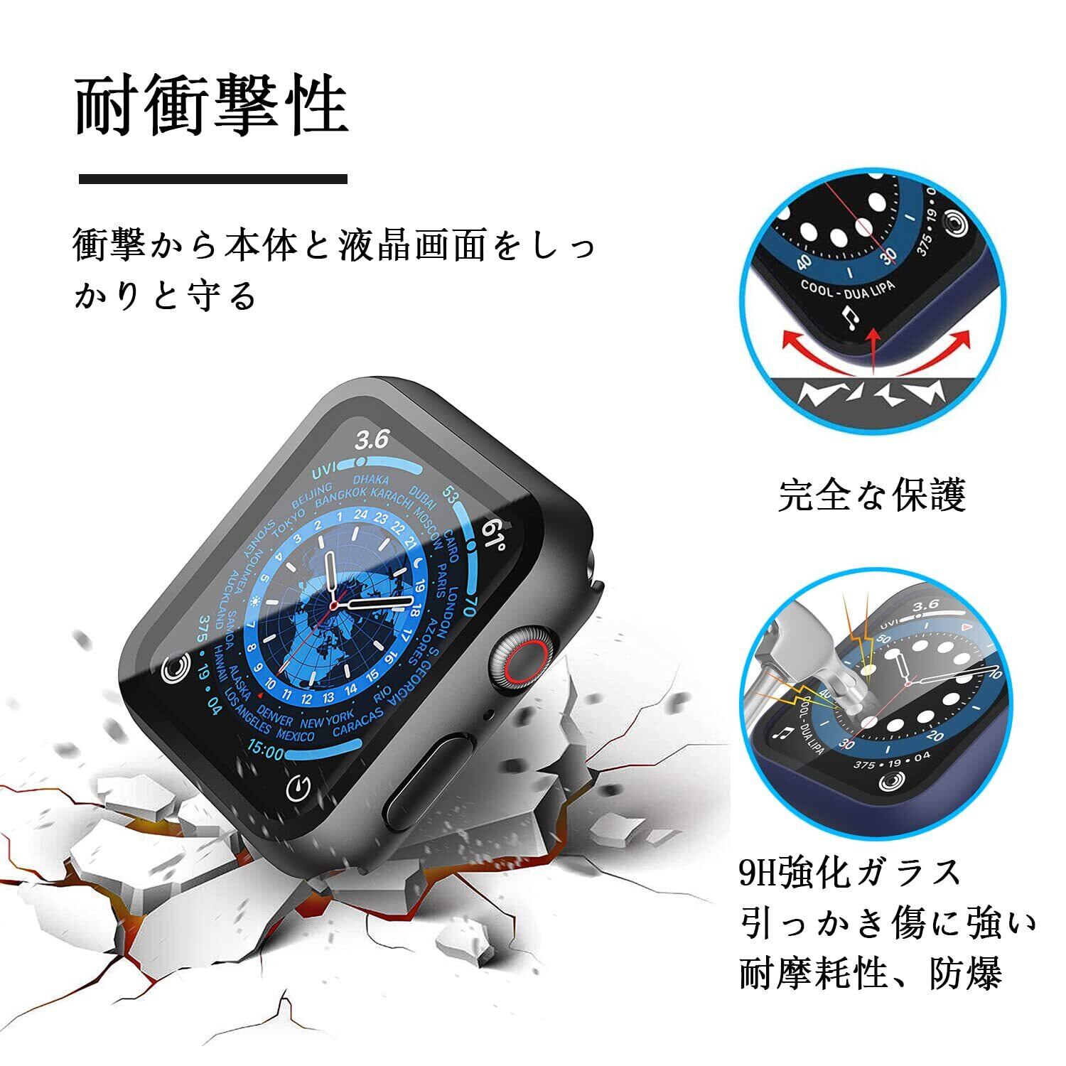 【3D 360°全面保護&9Hの硬度】新しく追加されたバックカバープロテクター、オールラウンドプロテクション。保護ケースは耐久性と柔軟性に優れたPC素材を使用し、アップルウォッチへの衝撃を最小限に抑えます。また、液晶部分には硬度9Hの強化ガラスを採用し、傷や衝撃から守ります。