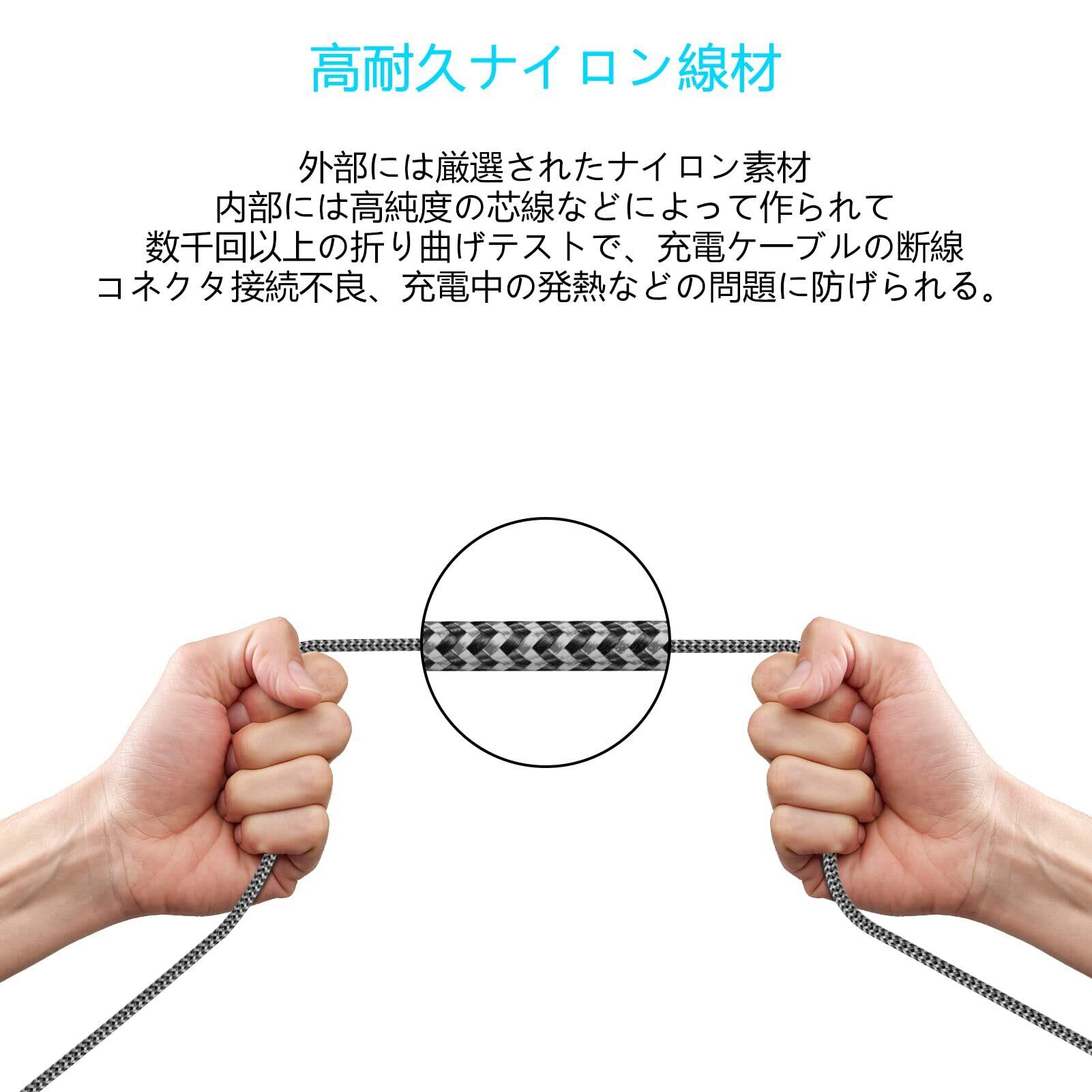 「断線に強くて、耐久性アップ 」: 外部には厳選されたナイロン素材、内部には無酸素銅、アルミ箔などは耐磨耗性に優れます。また、アルミ合金製コネクタは、高耐久性で抜挿寿命性向上、酸化·さび防止もできます。コードに柔軟性を持たせ、絡みにくて断線しにくて、耐久性が長いです。