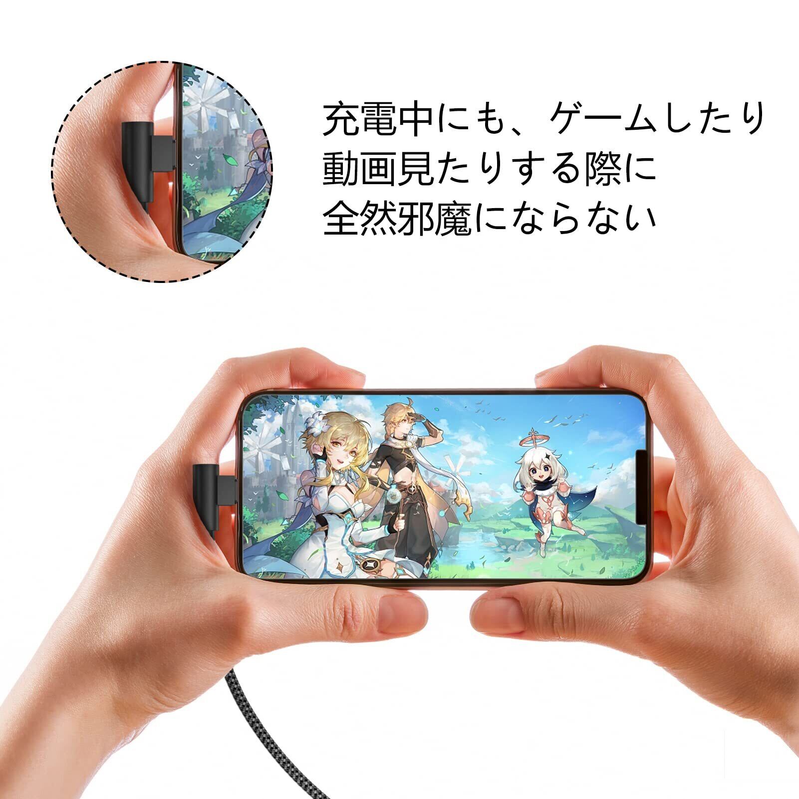 「抜き差し簡単 L型コネクタ」: 従来のケーブルとは異なり、90度に、曲がって「L字型」となっているので、充電の時には、ゲームの操作や動画を見るのは邪魔されない、接続する際にはポートに負荷がかからずケーブル部分が張り出しません。